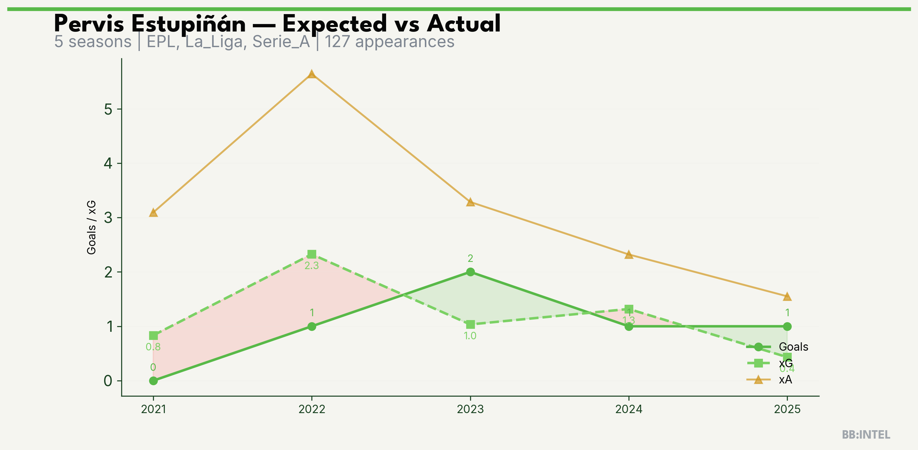 | 2023/2024 | EPL | 19 | 2 | 1.0 | 3.3 | 11 | +1.0 |