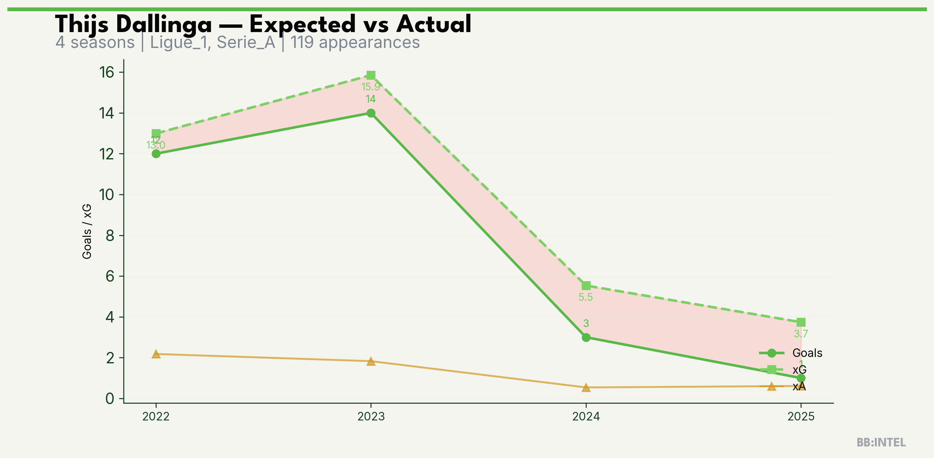 | 2025/2026 | Serie_A | 19 | 1 | 3.7 | 0.6 | 22 | -2.7 |