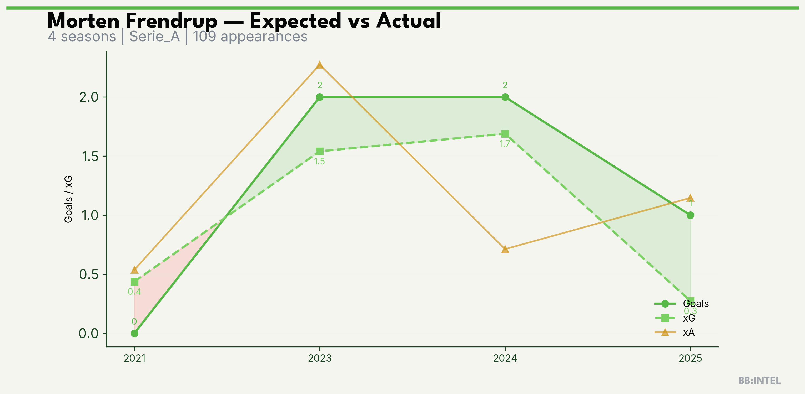 | 2025/2026 | Serie_A | 27 | 1 | 0.3 | 1.1 | 8 | +0.7 |