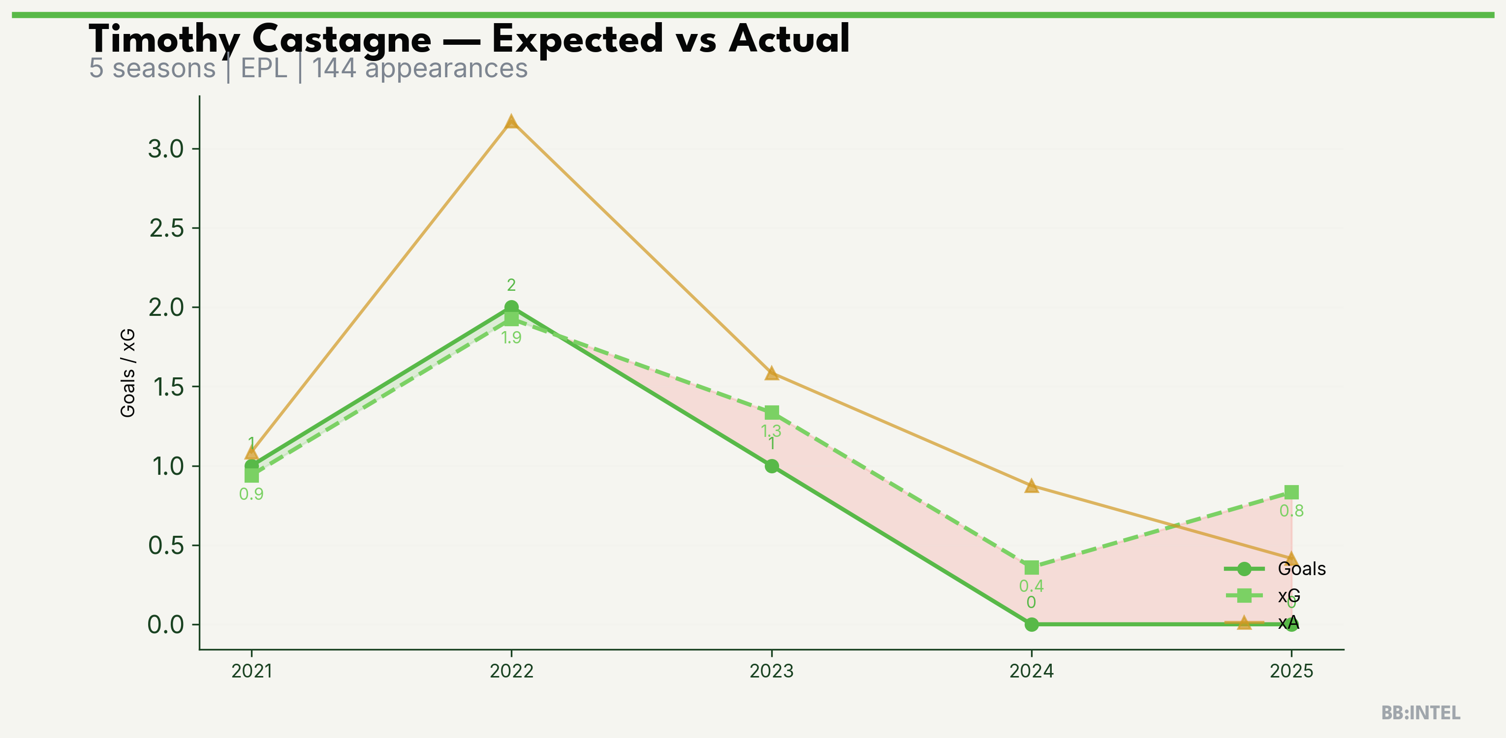 | 2025/2026 | EPL | 22 | 0 | 0.8 | 0.4 | 8 | -0.8 |
