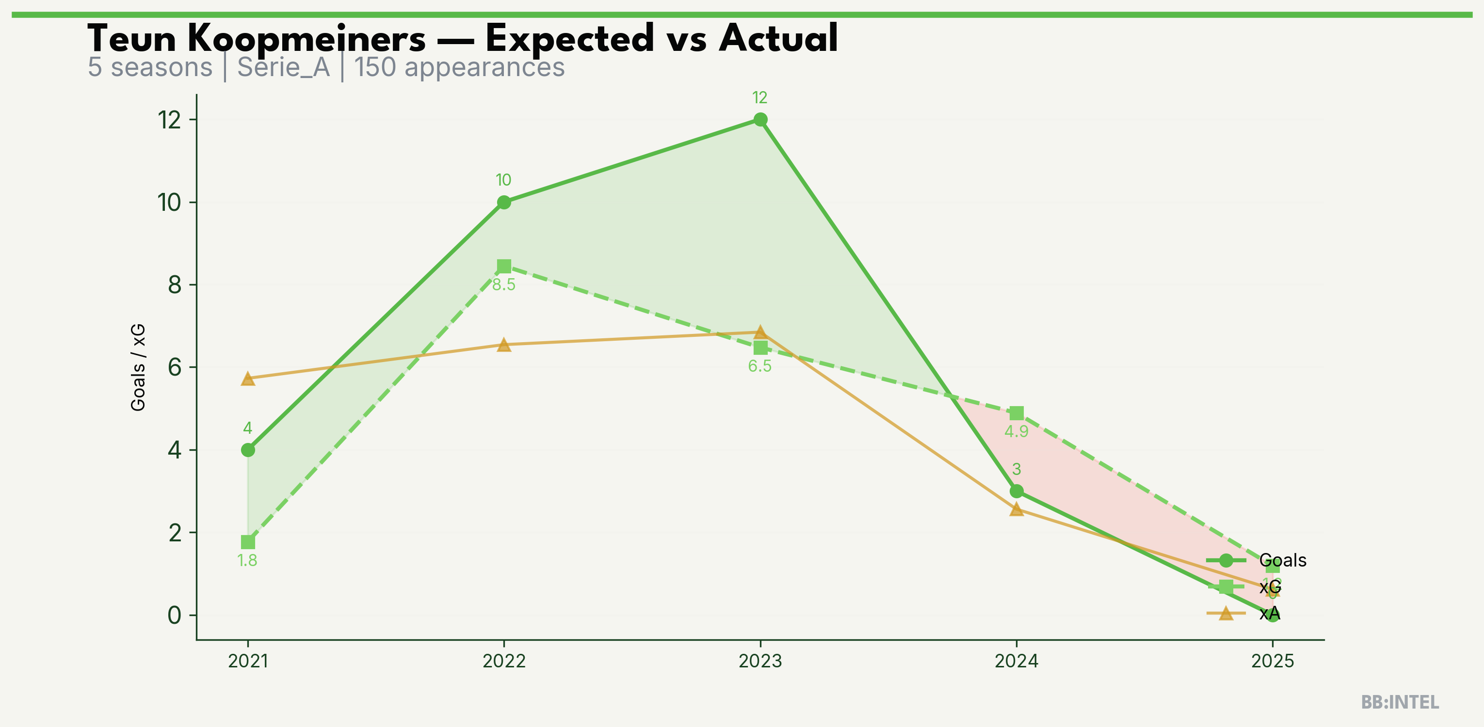 | 2023/2024 | Serie_A | 34 | 12 | 6.5 | 6.8 | 54 | +5.5 |