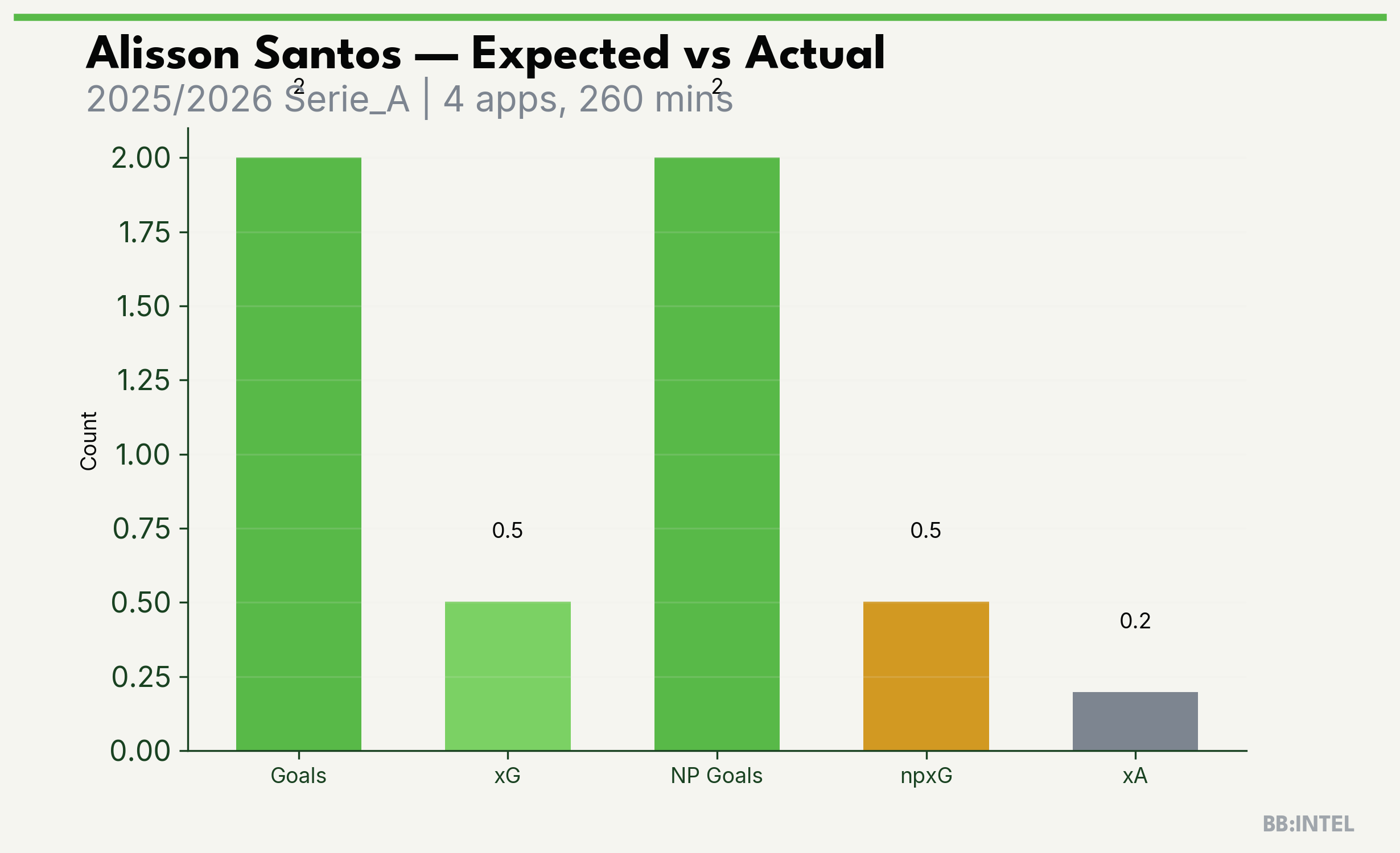 | 2025/2026 | Serie_A | 4 | 2 | 0.5 | 0.2 | 9 | +1.5 |