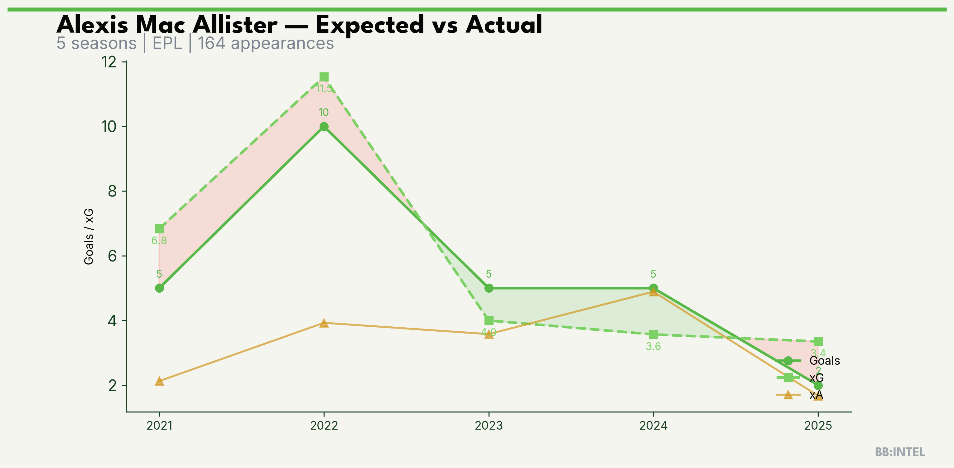 | 2024/2025 | EPL | 35 | 5 | 3.6 | 4.9 | 38 | +1.4 |