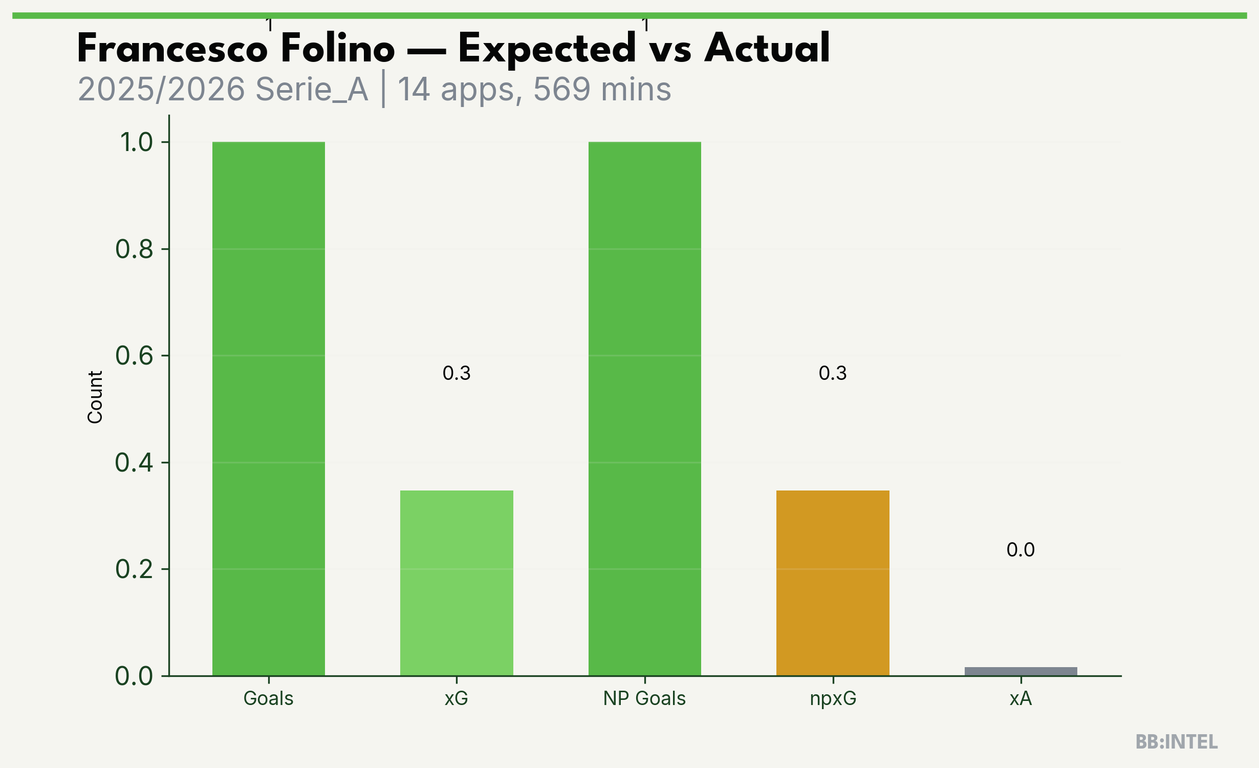 | 2025/2026 | Serie_A | 14 | 1 | 0.3 | 0.0 | 1 | +0.7 |