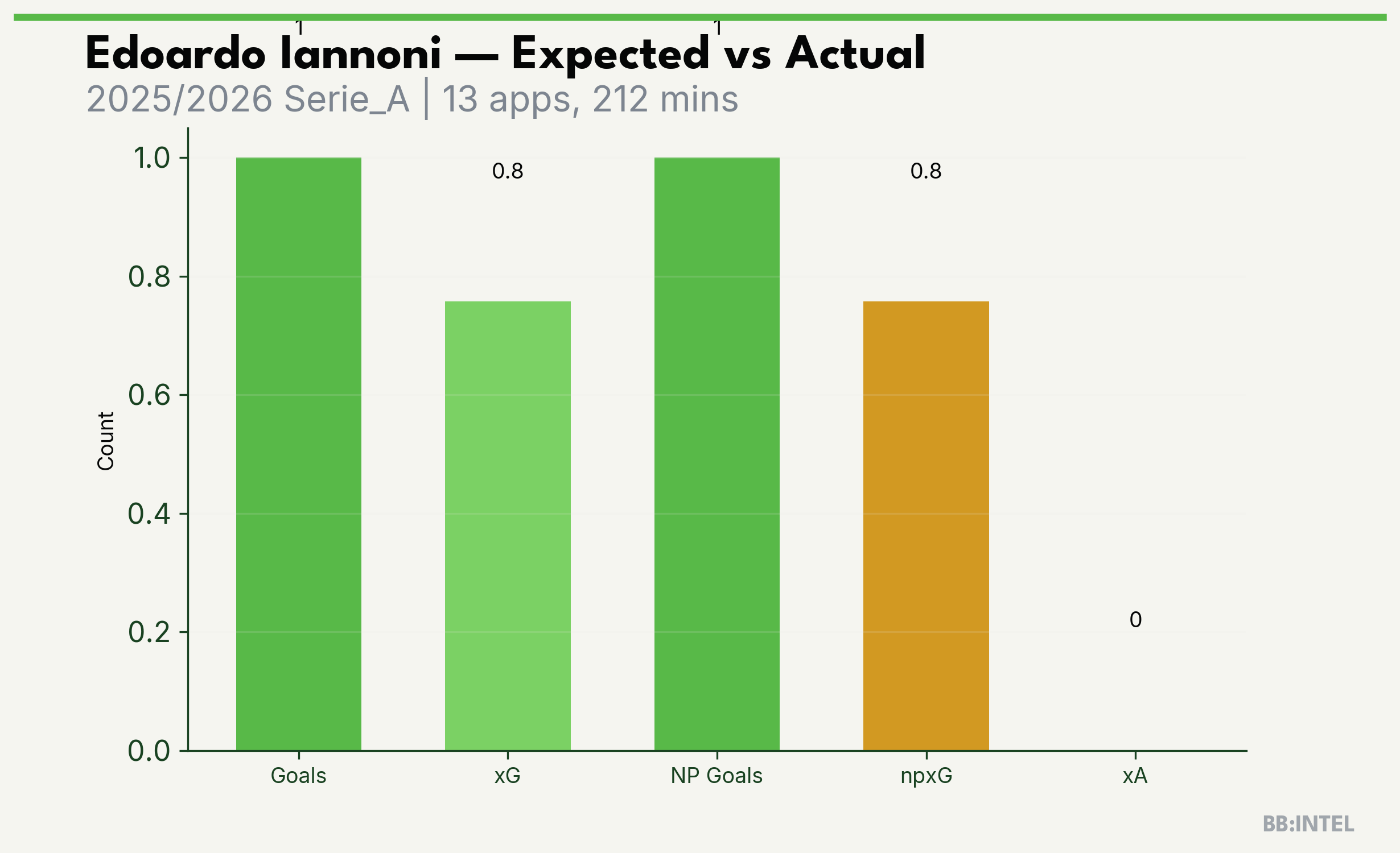 | 2025/2026 | Serie_A | 13 | 1 | 0.8 | 0.0 | 3 | +0.2 |
