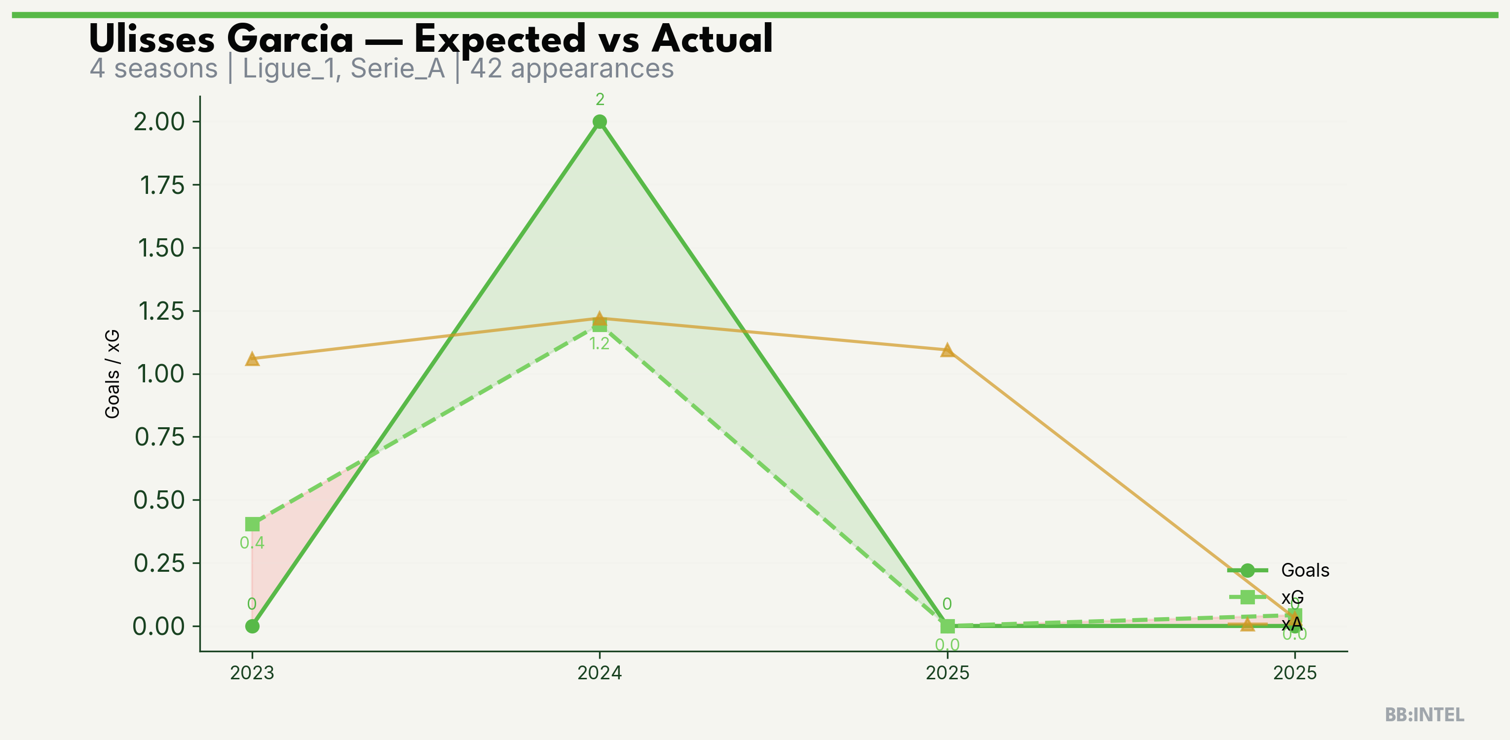 | 2024/2025 | Ligue_1 | 20 | 2 | 1.2 | 1.2 | 8 | +0.8 |
