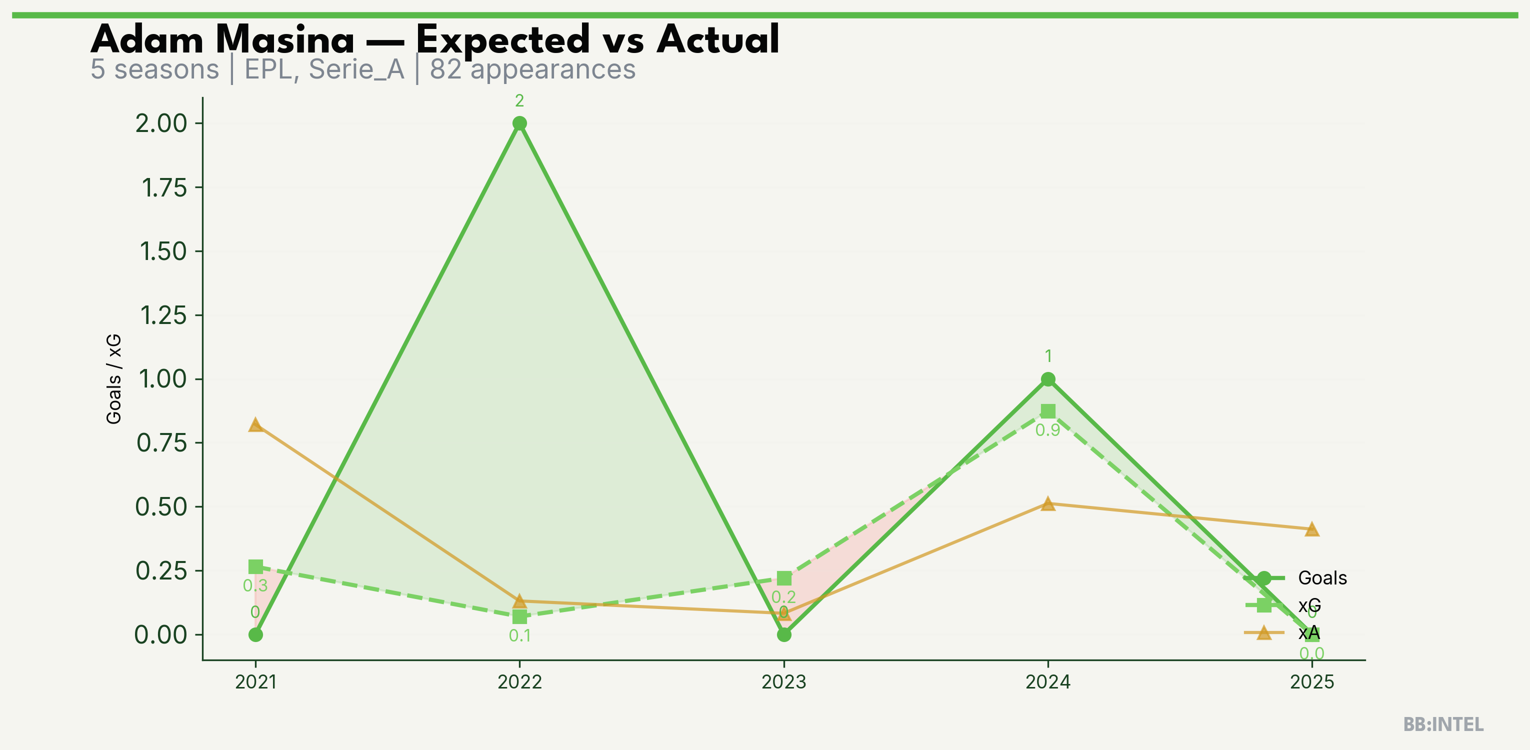 | 2022/2023 | Serie_A | 14 | 2 | 0.1 | 0.1 | 2 | +1.9 |