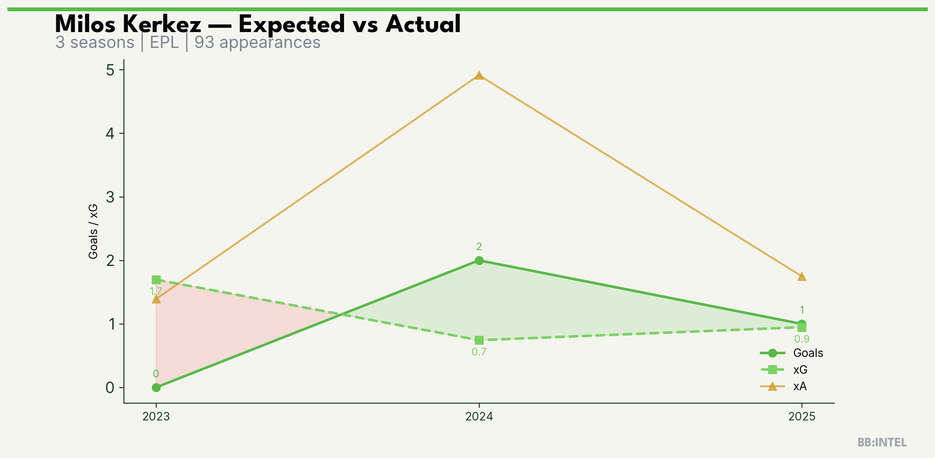| 2024/2025 | EPL | 38 | 2 | 0.7 | 4.9 | 19 | +1.3 |