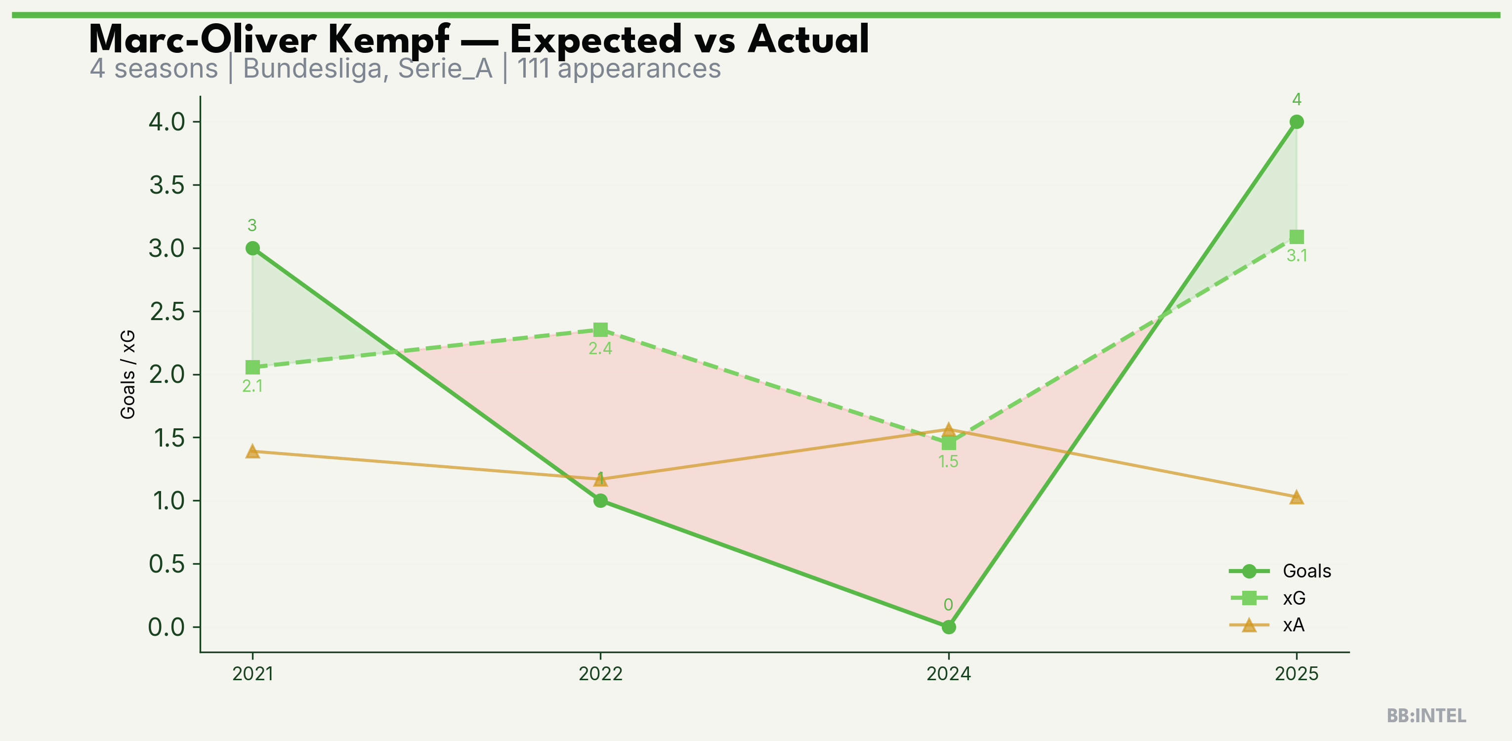 | 2021/2022 | Bundesliga | 24 | 3 | 2.1 | 1.4 | 20 | +0.9 |