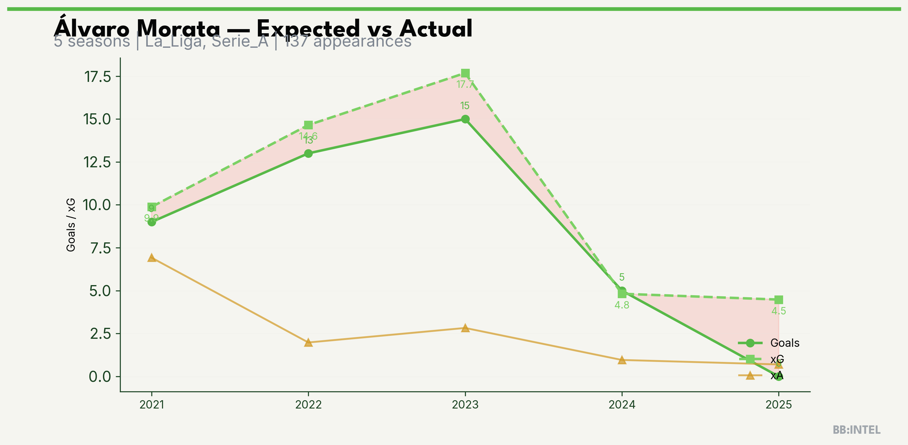 | 2023/2024 | La_Liga | 32 | 15 | 17.7 | 2.8 | 67 | -2.7 |