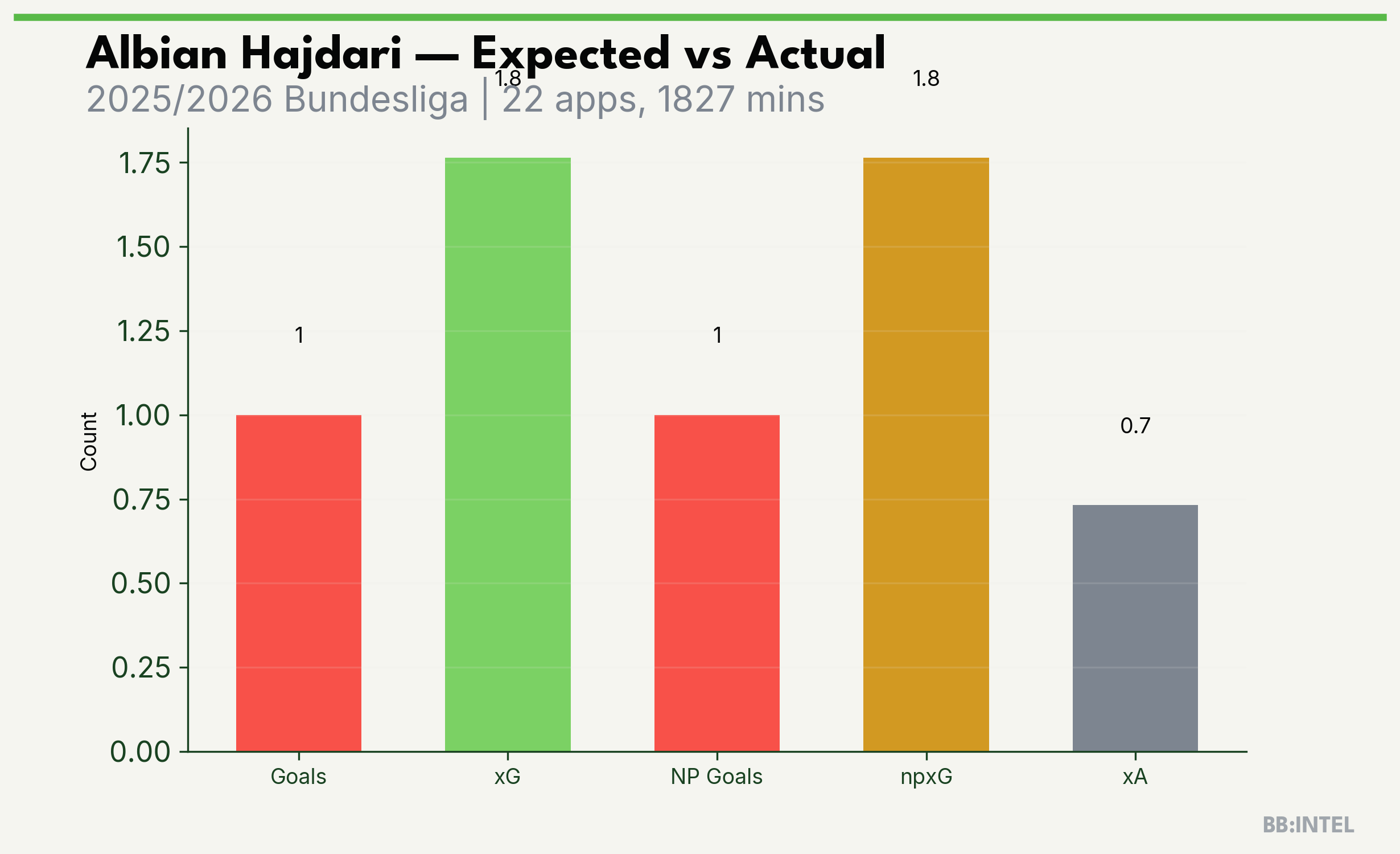 | 2025/2026 | Bundesliga | 22 | 1 | 1.8 | 0.7 | 13 | -0.8 |