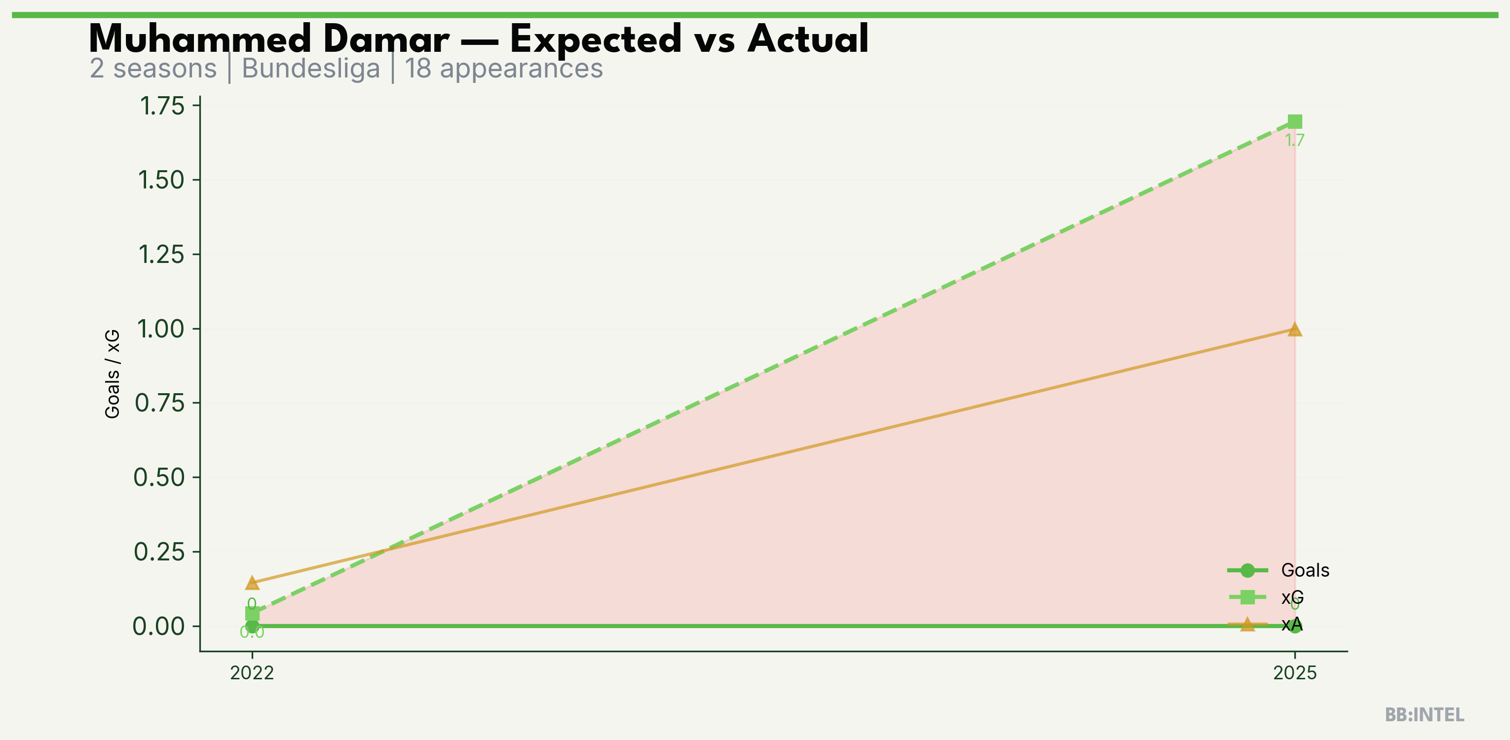 | 2025/2026 | Bundesliga | 12 | 0 | 1.7 | 1.0 | 11 | -1.7 |