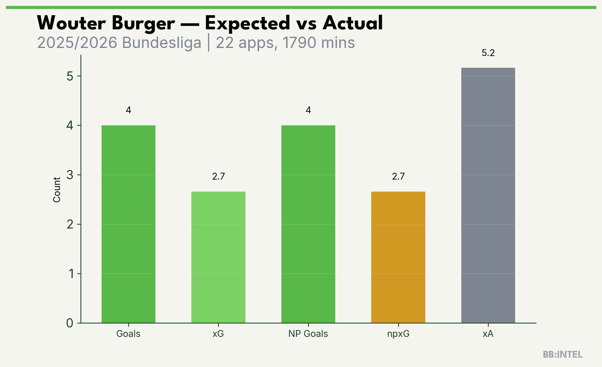 | 2025/2026 | Bundesliga | 22 | 4 | 2.7 | 5.2 | 24 | +1.3 |