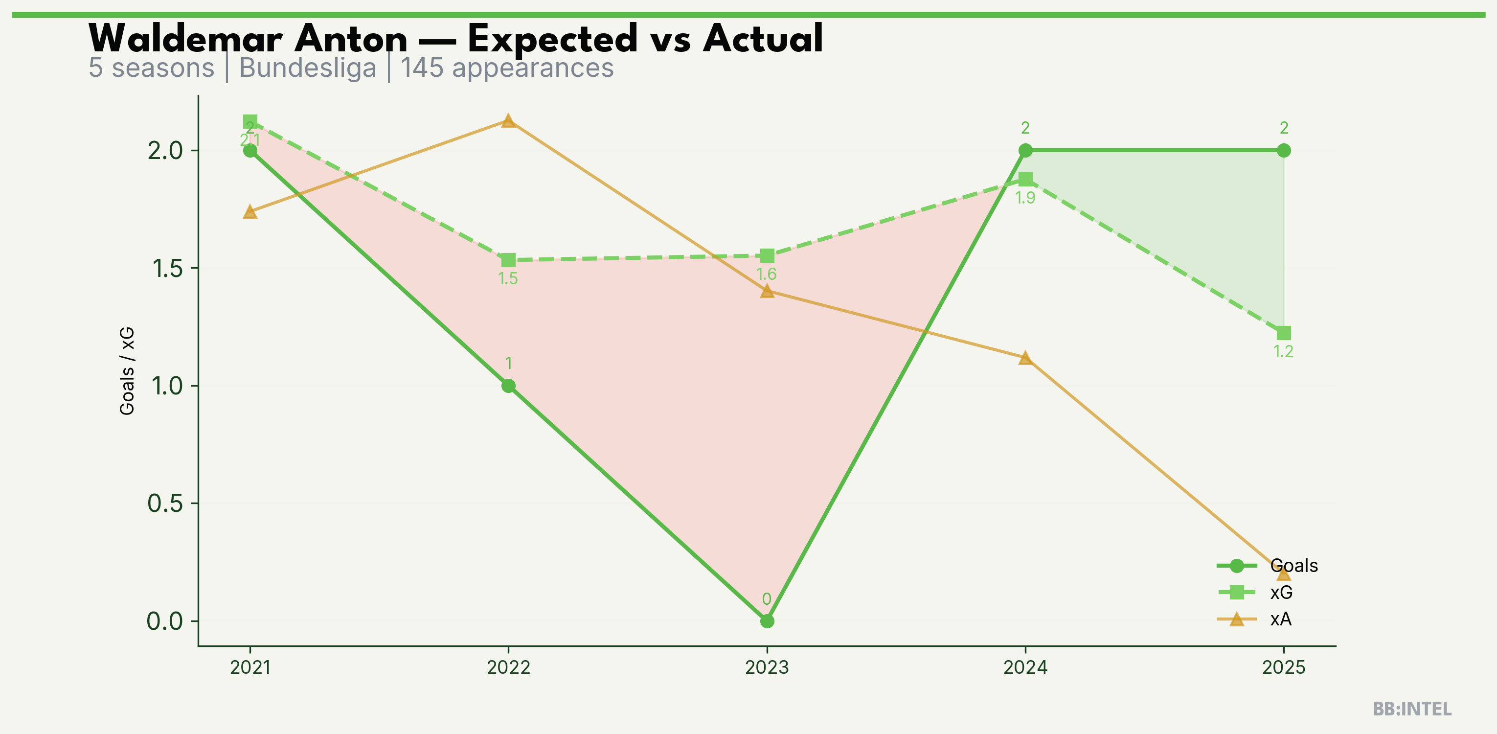 | 2024/2025 | Bundesliga | 26 | 2 | 1.9 | 1.1 | 19 | +0.1 |
