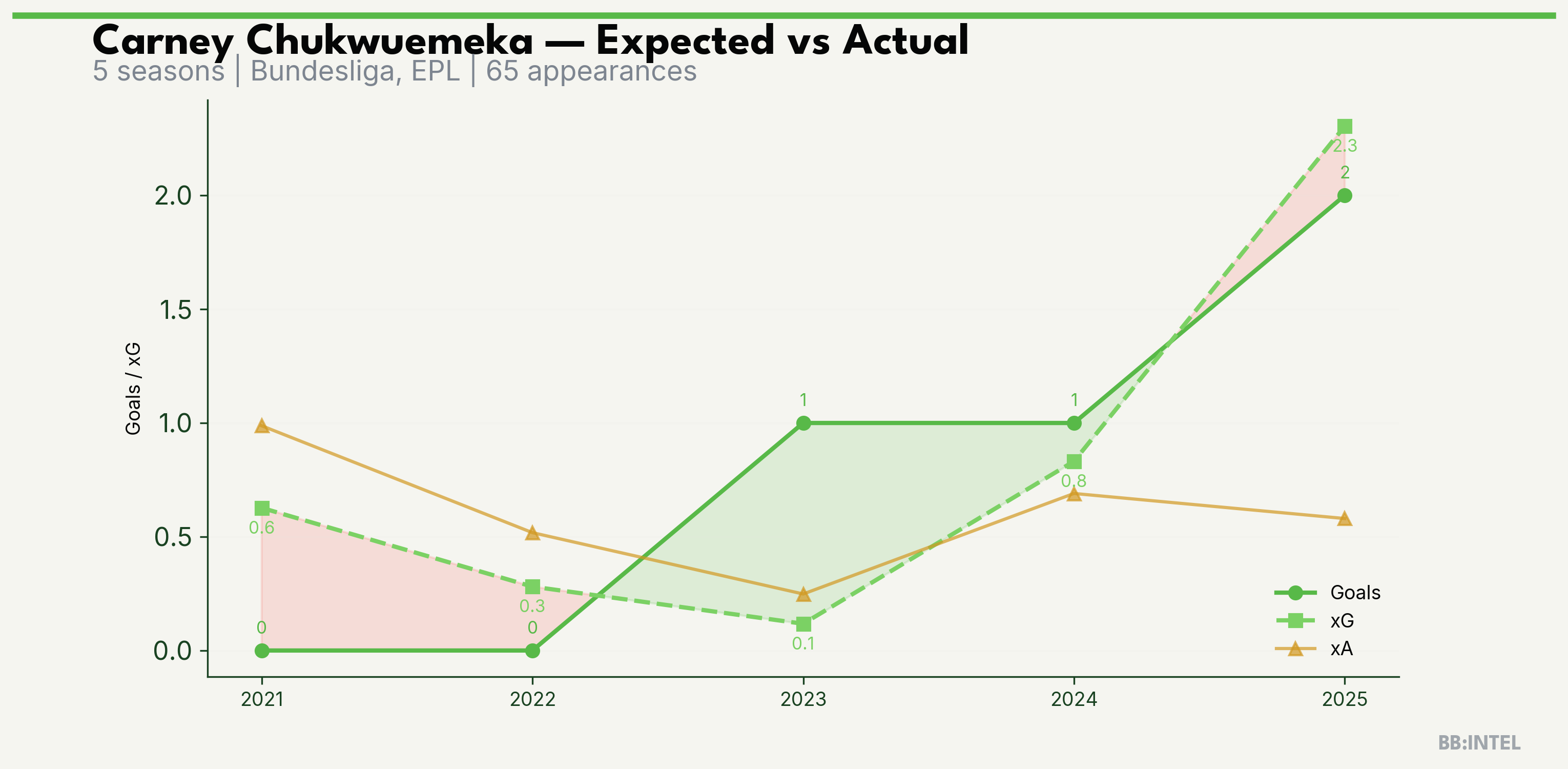 | 2025/2026 | Bundesliga | 20 | 2 | 2.3 | 0.6 | 14 | -0.3 |