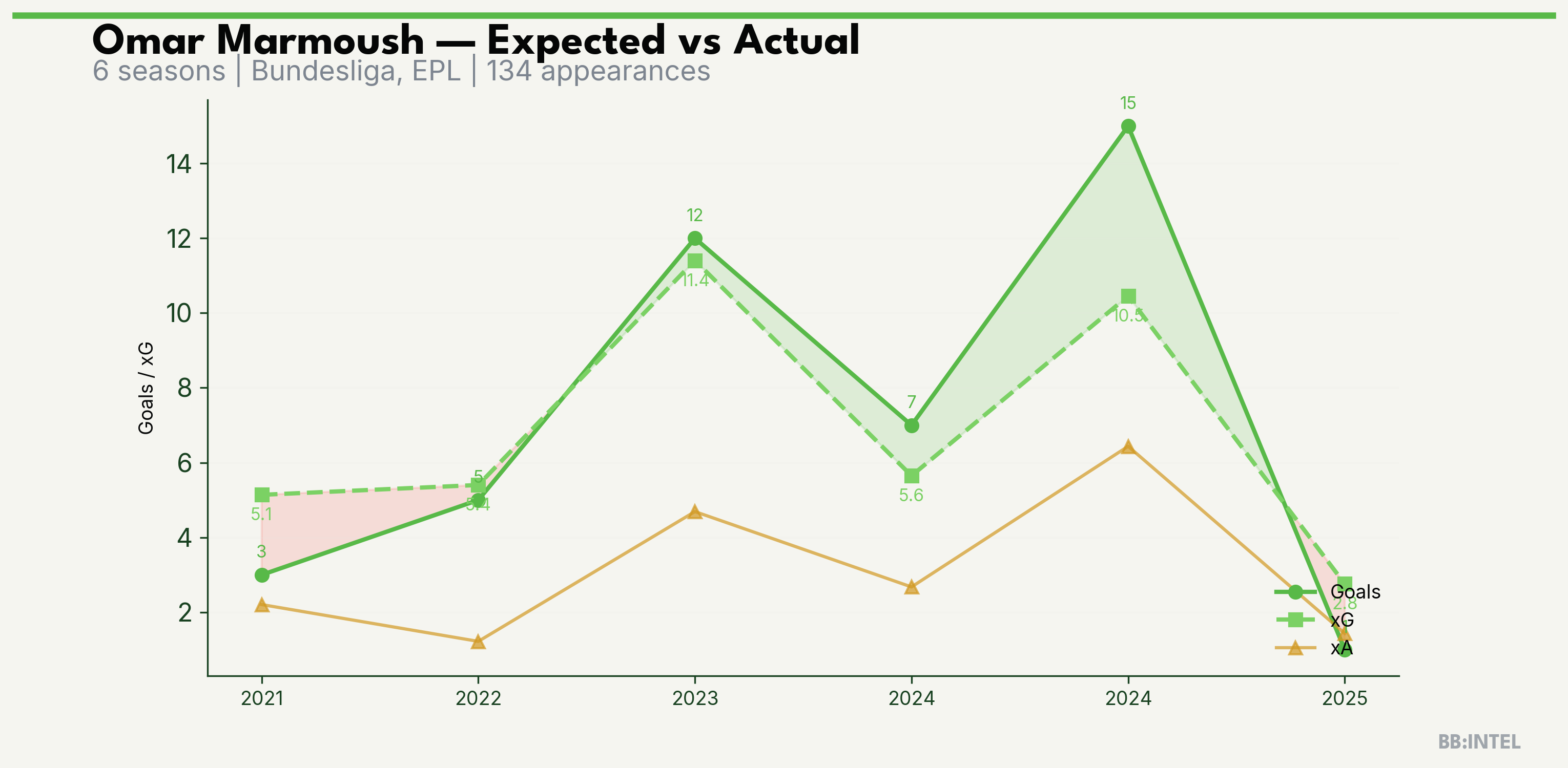| 2024/2025 | EPL | 16 | 7 | 5.6 | 2.7 | 49 | +1.4 |