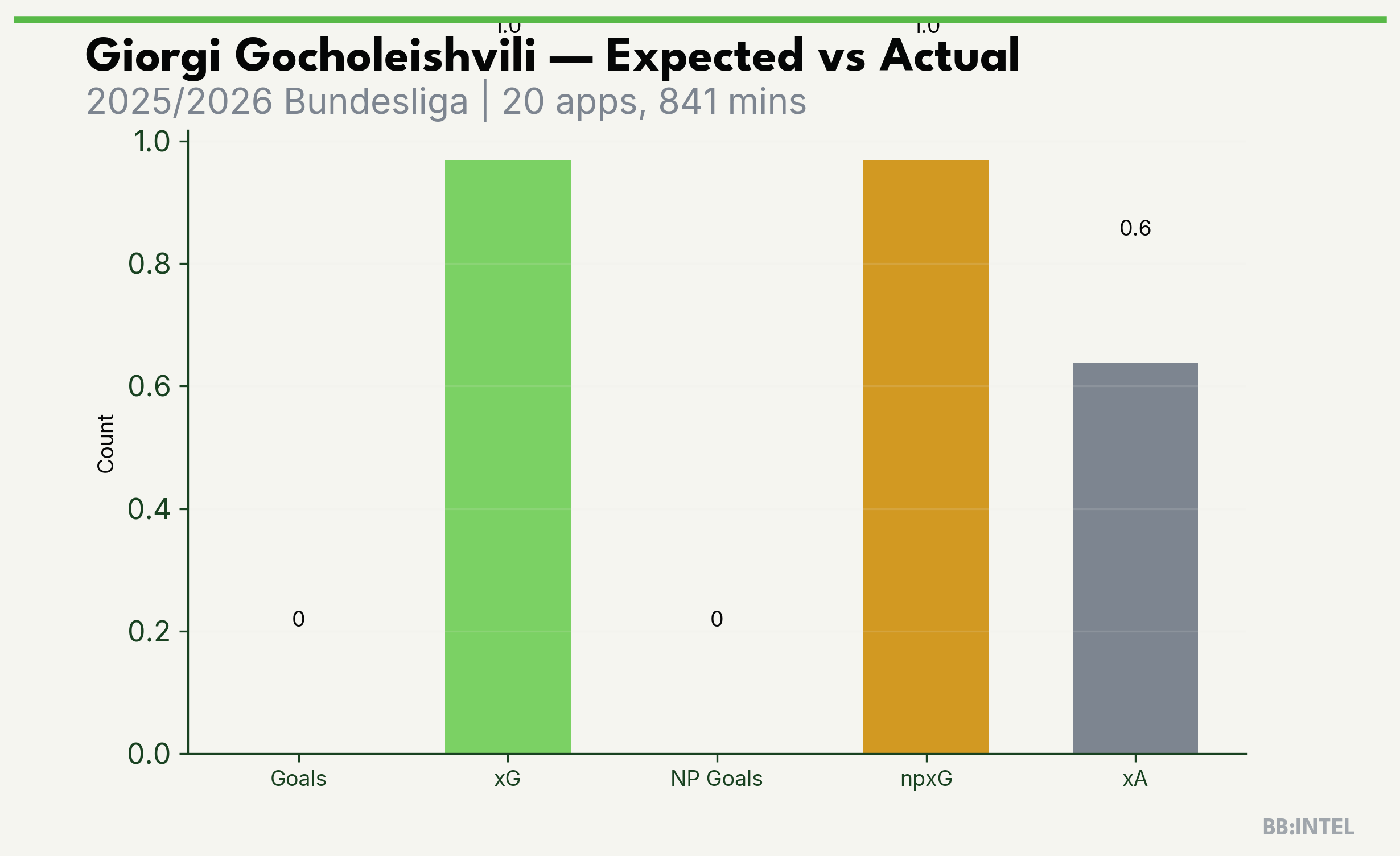 | 2025/2026 | Bundesliga | 20 | 0 | 1.0 | 0.6 | 13 | -1.0 |