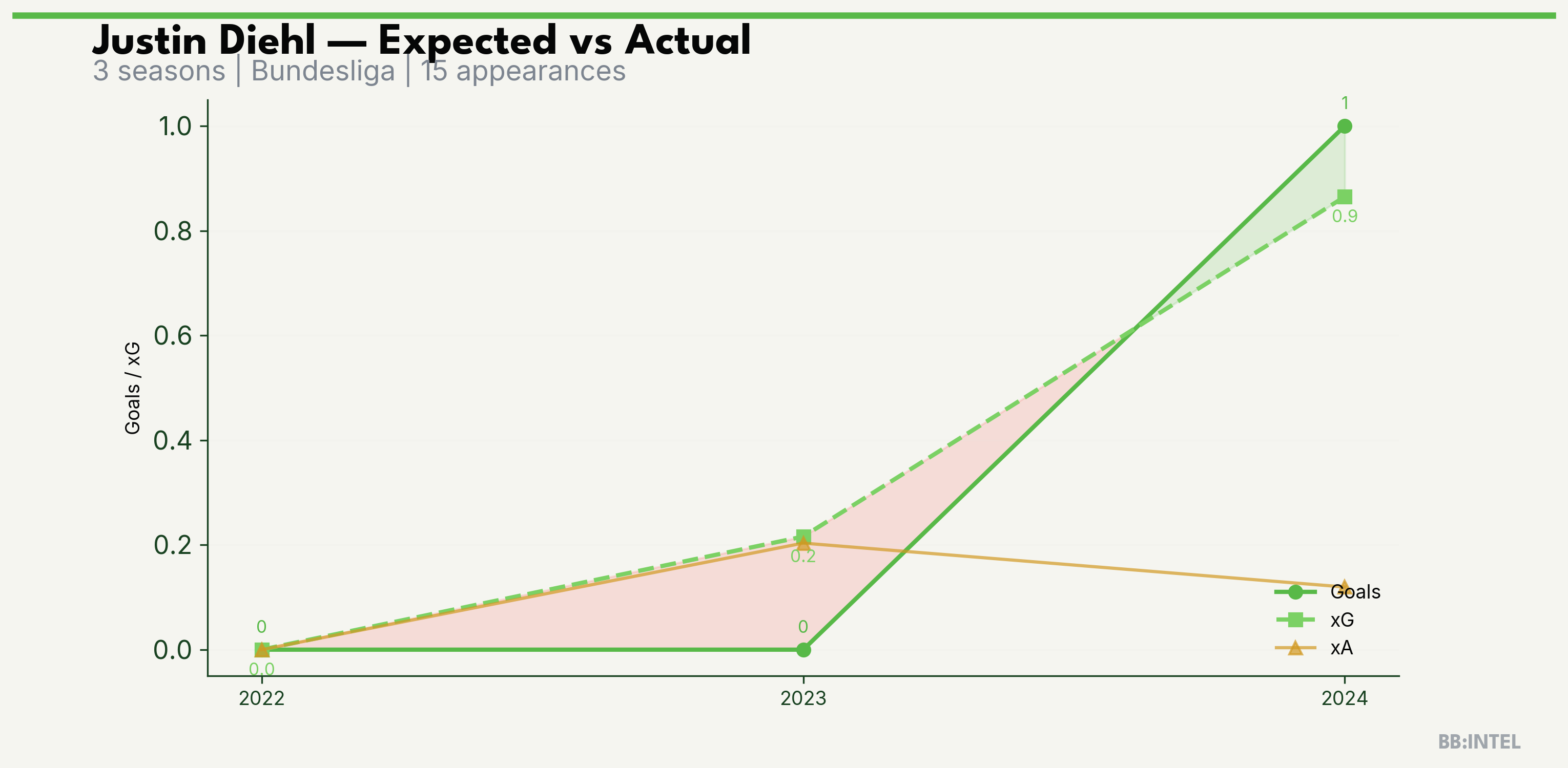 | 2024/2025 | Bundesliga | 6 | 1 | 0.9 | 0.1 | 7 | +0.1 |