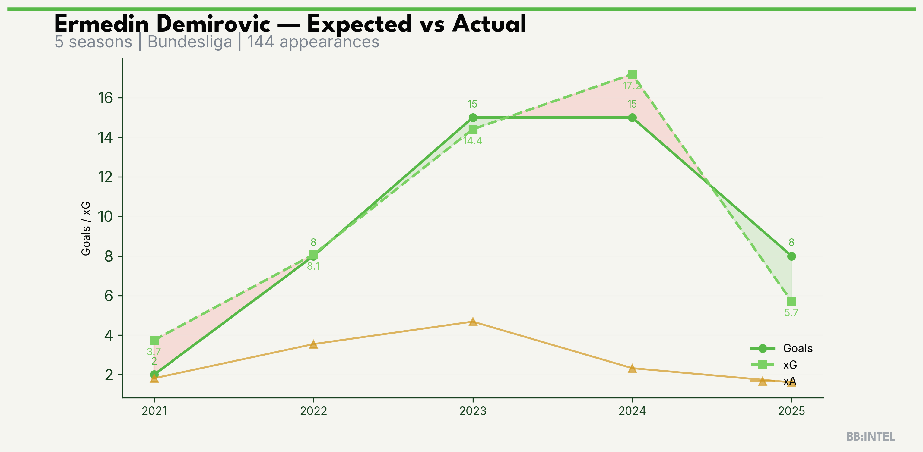 | 2024/2025 | Bundesliga | 34 | 15 | 17.2 | 2.3 | 66 | -2.2 |