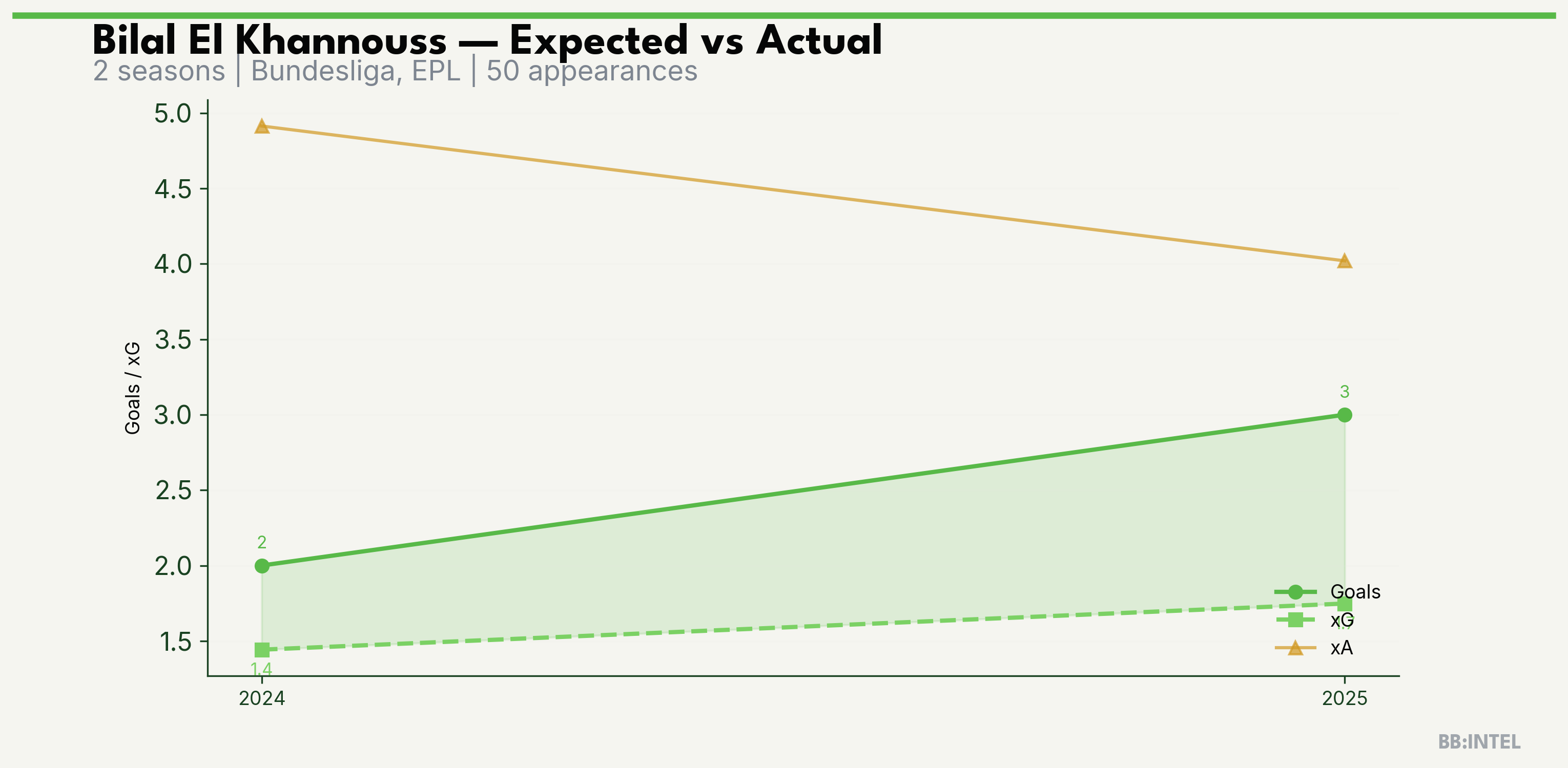 | 2025/2026 | Bundesliga | 18 | 3 | 1.7 | 4.0 | 30 | +1.3 |