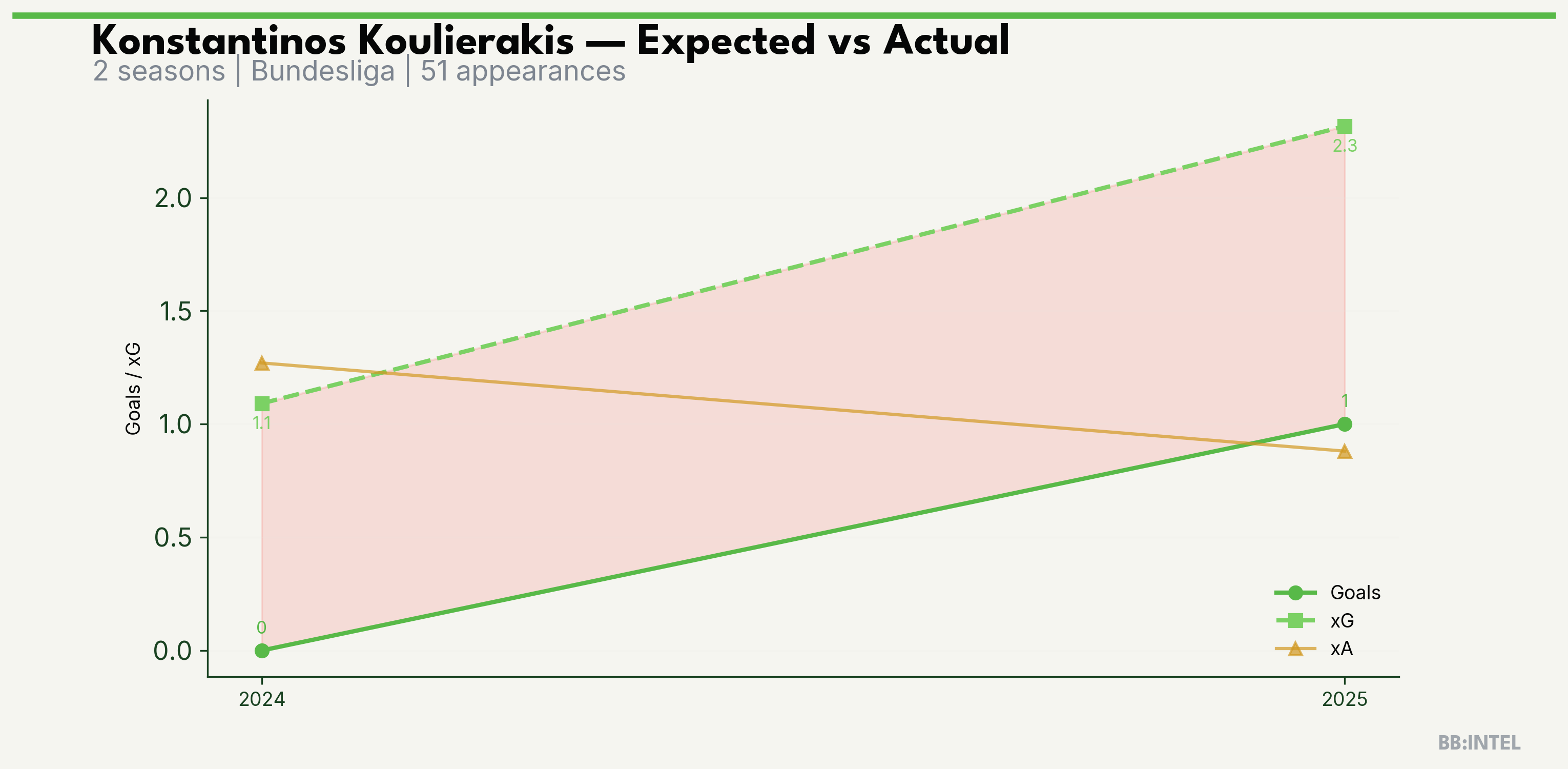 | 2025/2026 | Bundesliga | 21 | 1 | 2.3 | 0.9 | 20 | -1.3 |