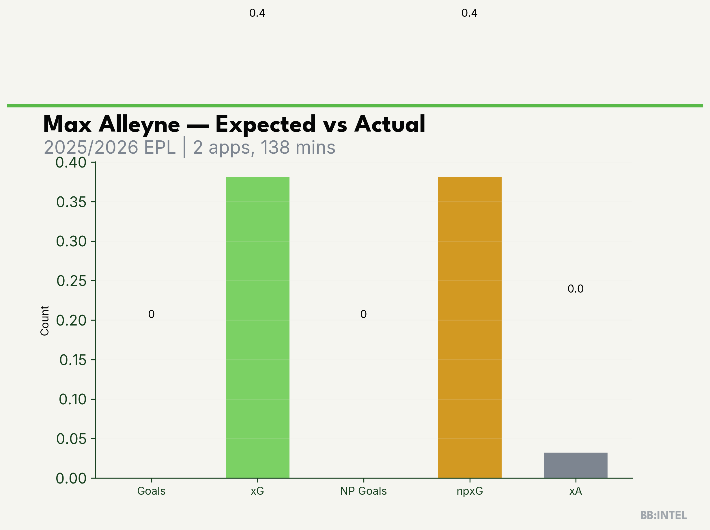 | 2025/2026 | EPL | 2 | 0 | 0.4 | 0.0 | 2 | -0.4 |