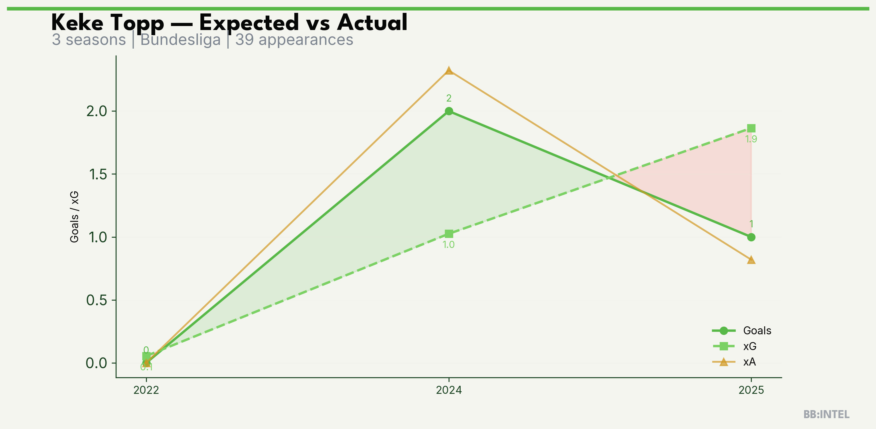 | 2025/2026 | Bundesliga | 19 | 1 | 1.9 | 0.8 | 23 | -0.9 |