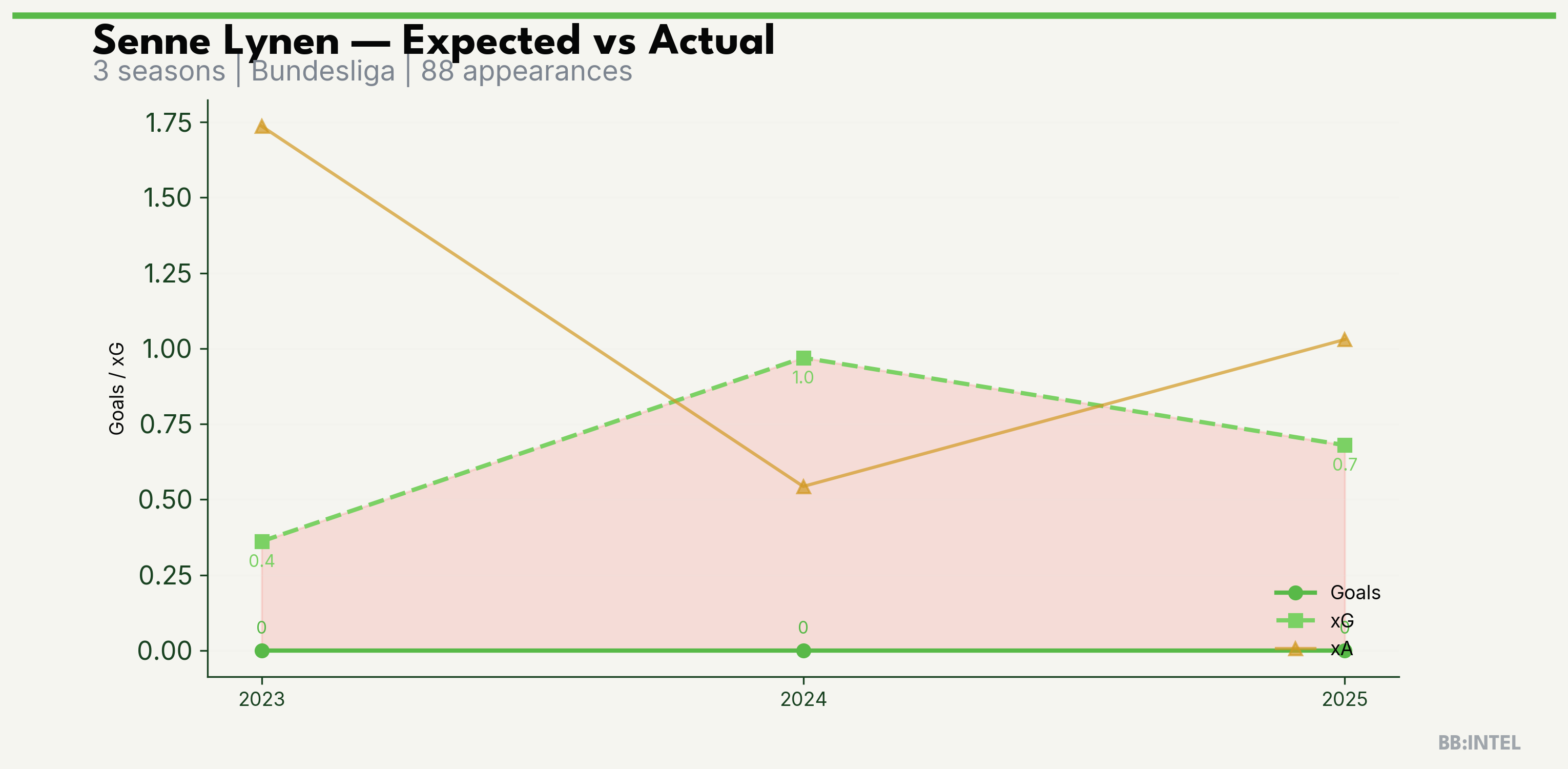 | 2025/2026 | Bundesliga | 24 | 0 | 0.7 | 1.0 | 17 | -0.7 |