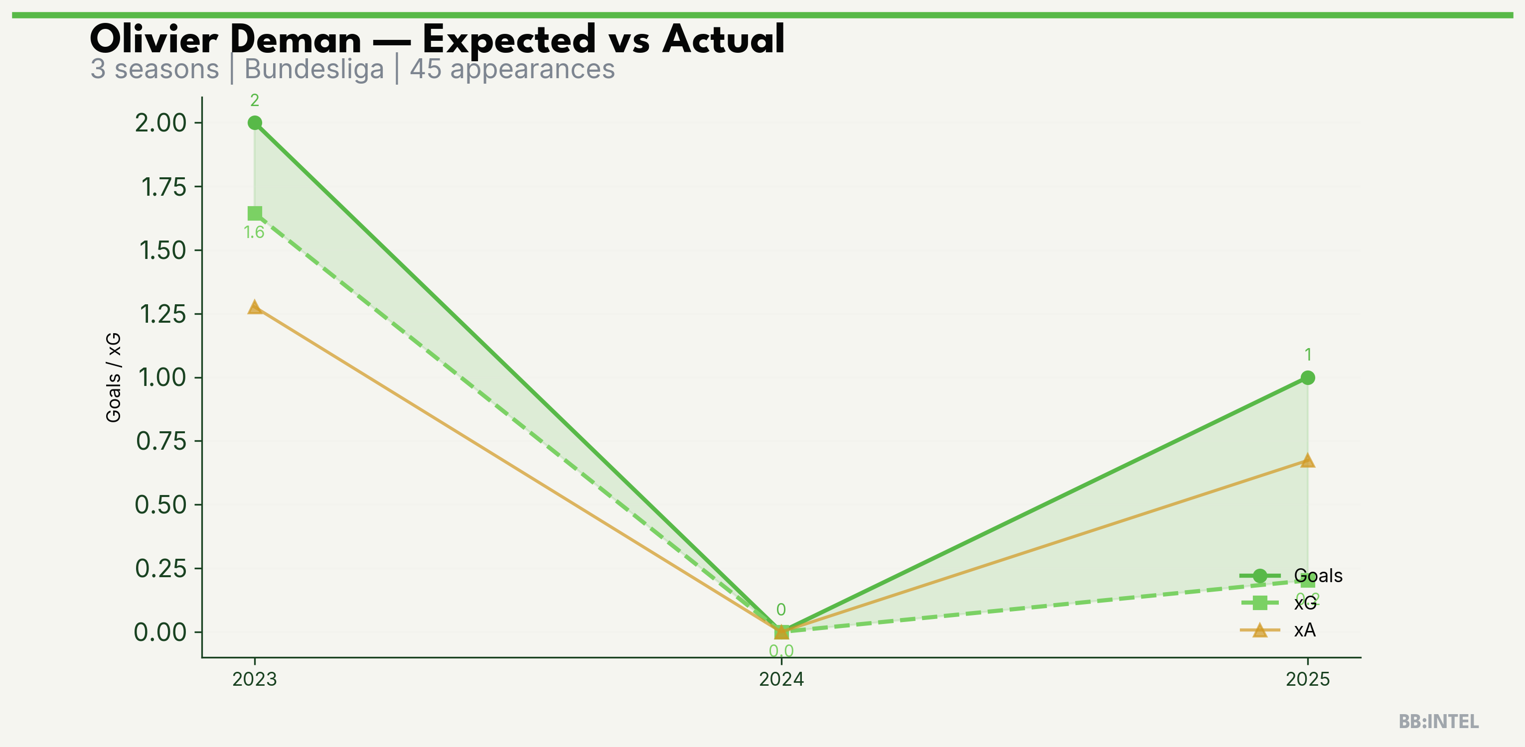 | 2023/2024 | Bundesliga | 29 | 2 | 1.6 | 1.3 | 17 | +0.4 |