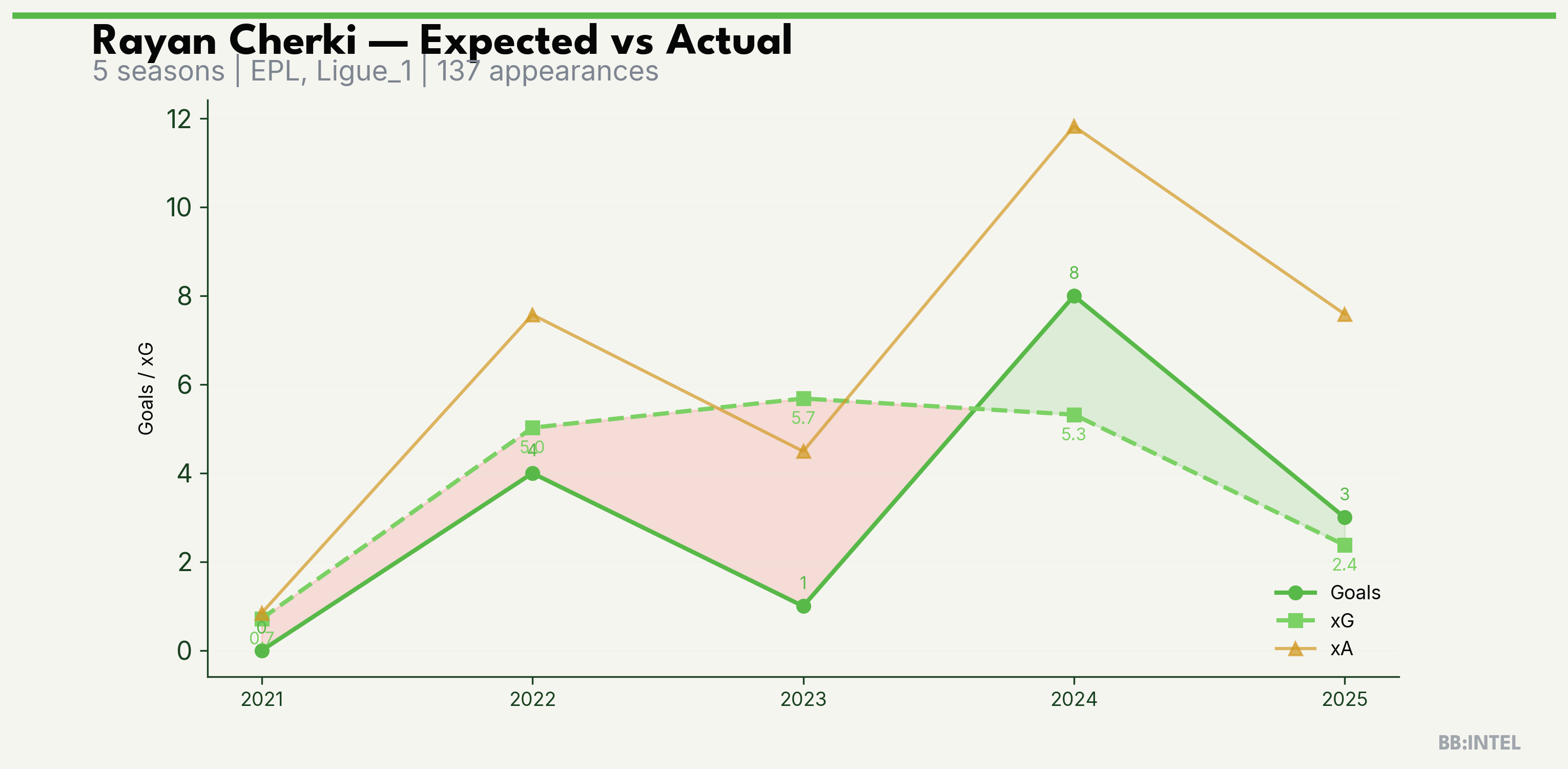 | 2025/2026 | EPL | 24 | 3 | 2.4 | 7.6 | 31 | +0.6 |