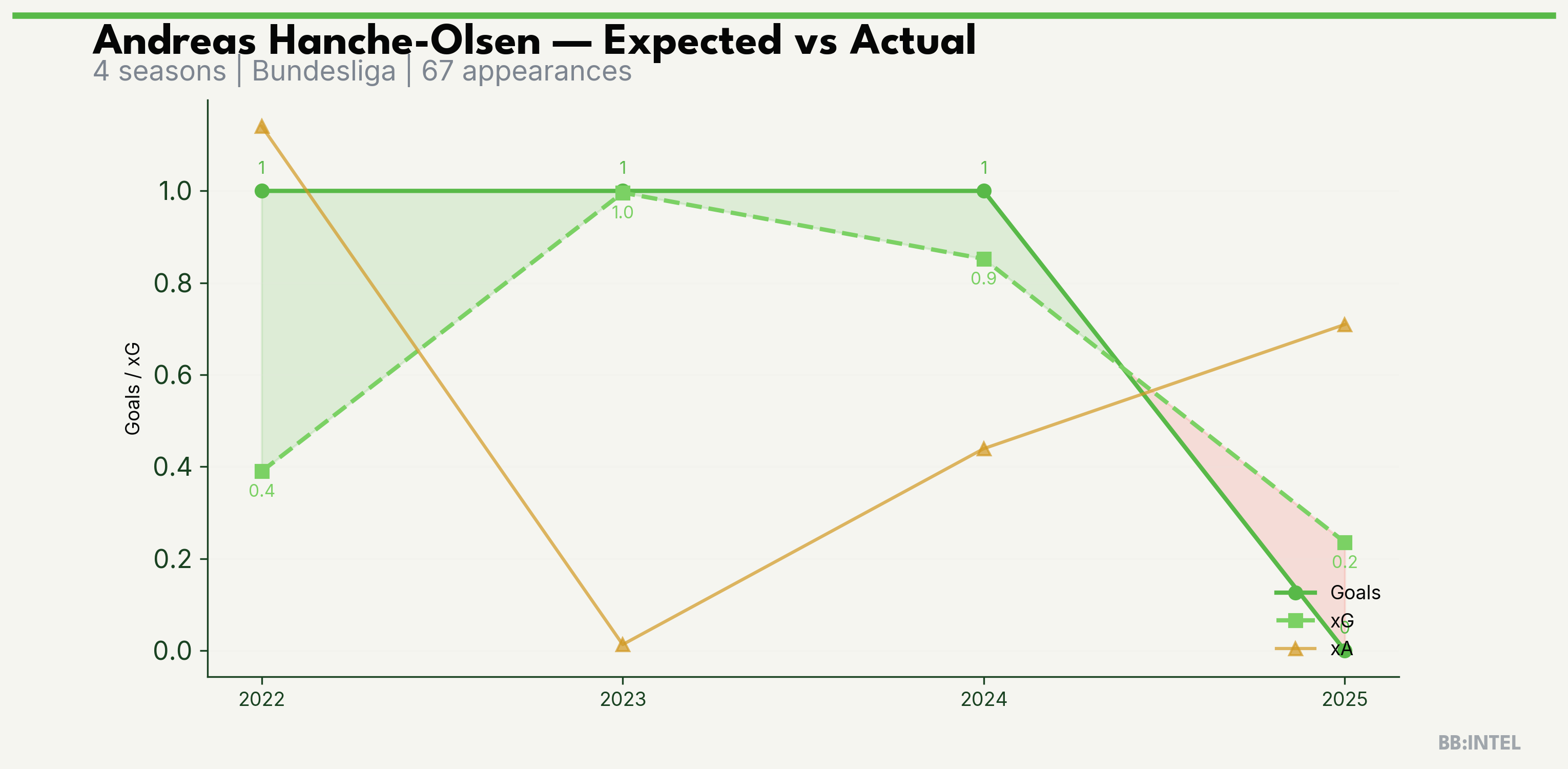 | 2025/2026 | Bundesliga | 13 | 0 | 0.2 | 0.7 | 6 | -0.2 |