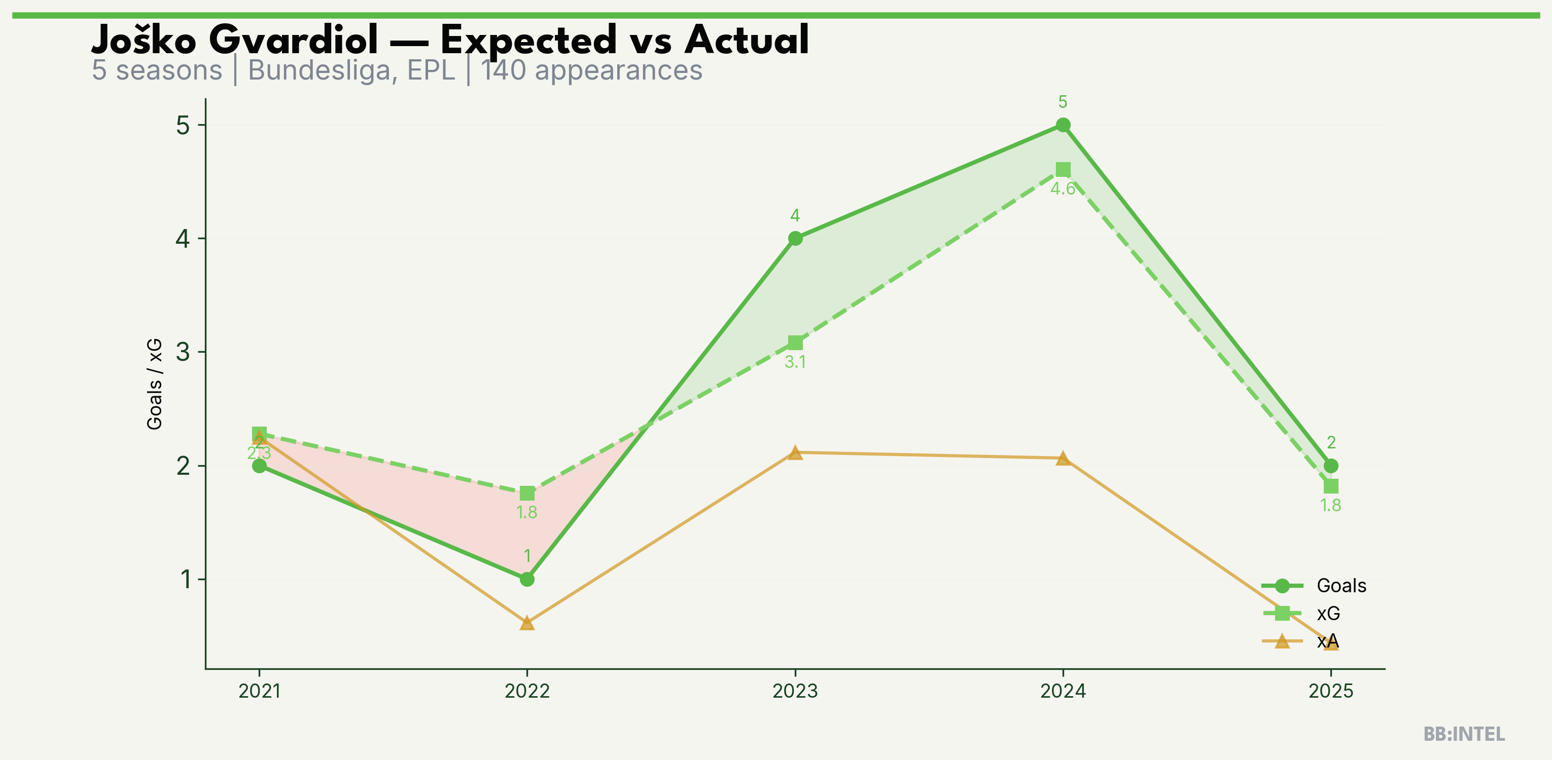 | 2025/2026 | EPL | 16 | 2 | 1.8 | 0.4 | 16 | +0.2 |