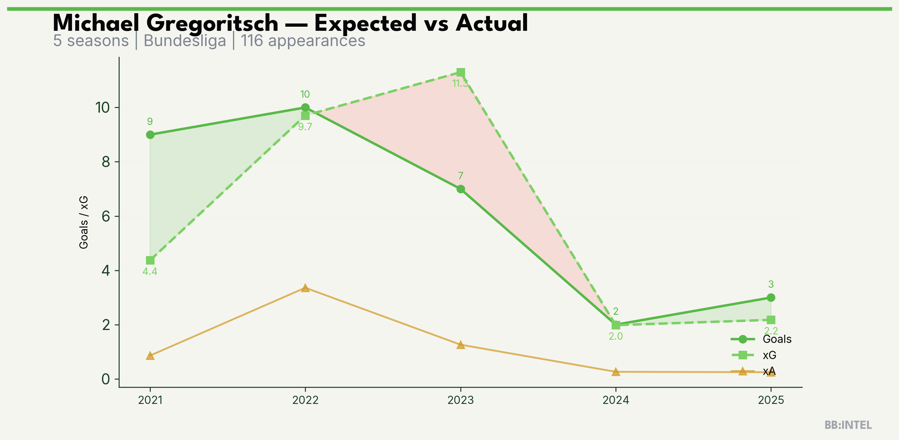 | 2025/2026 | Bundesliga | 9 | 3 | 2.2 | 0.2 | 11 | +0.8 |