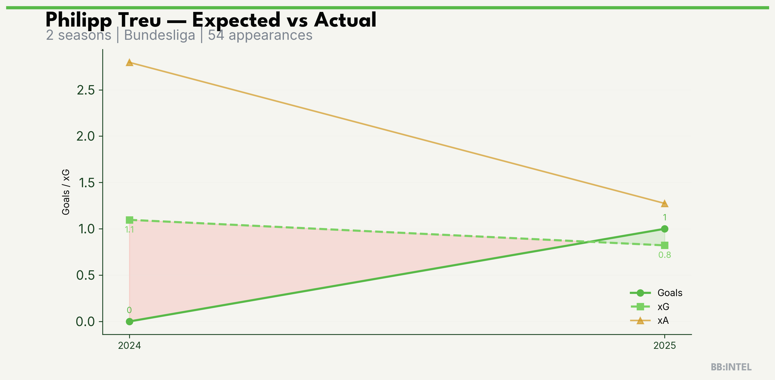 | 2024/2025 | Bundesliga | 33 | 0 | 1.1 | 2.8 | 18 | -1.1 |