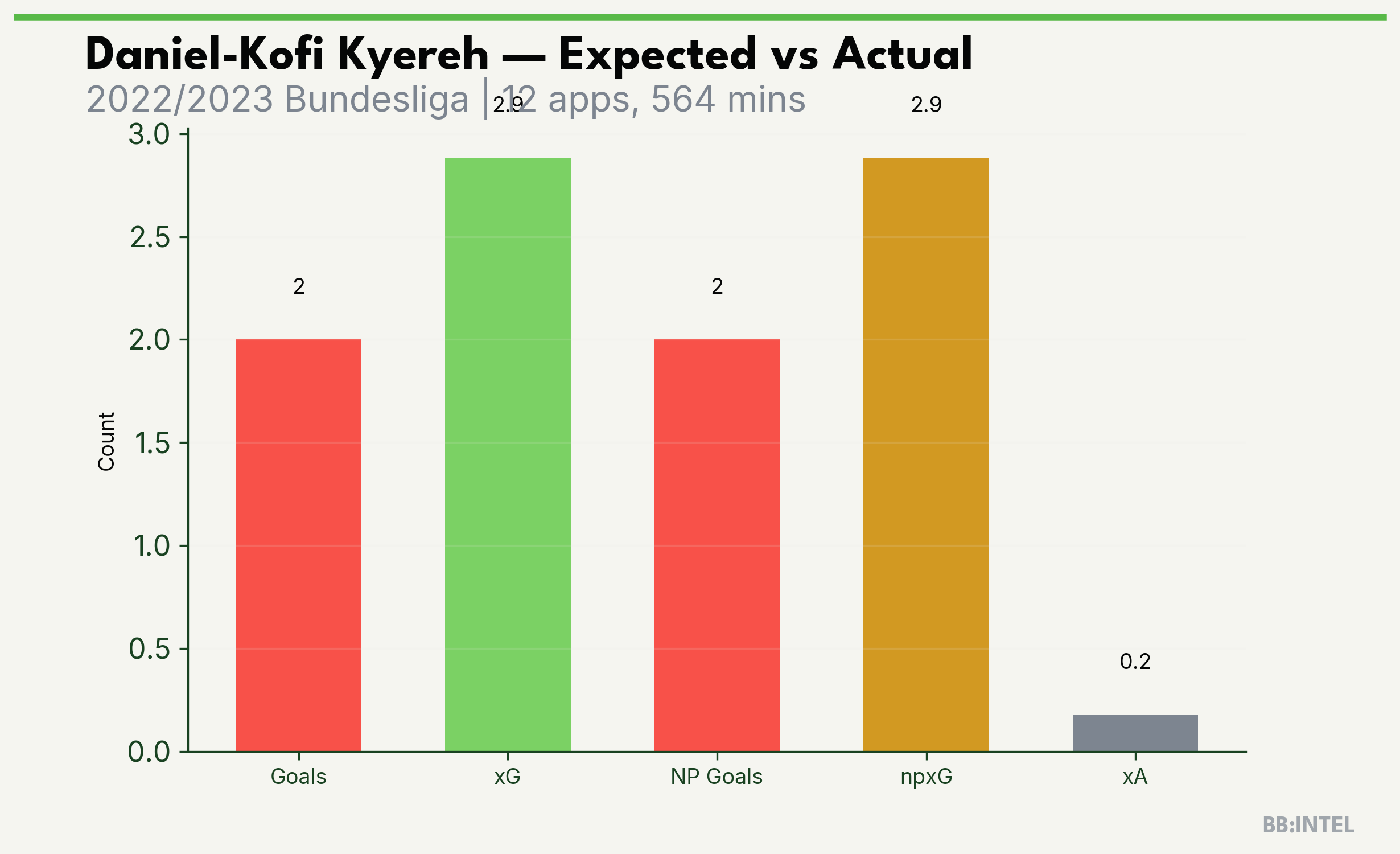 | 2022/2023 | Bundesliga | 12 | 2 | 2.9 | 0.2 | 12 | -0.9 |