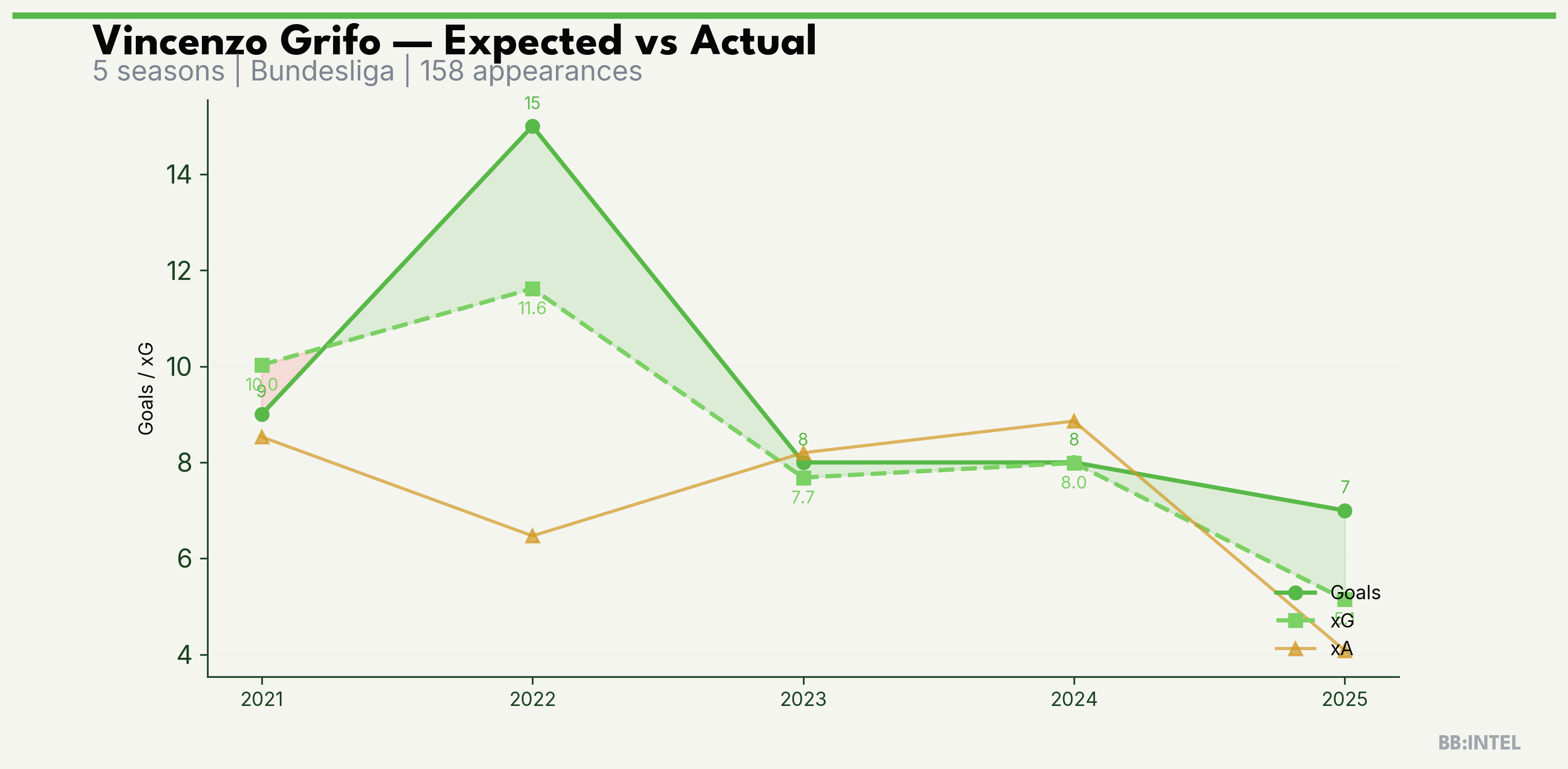 | 2022/2023 | Bundesliga | 33 | 15 | 11.6 | 6.5 | 66 | +3.4 |