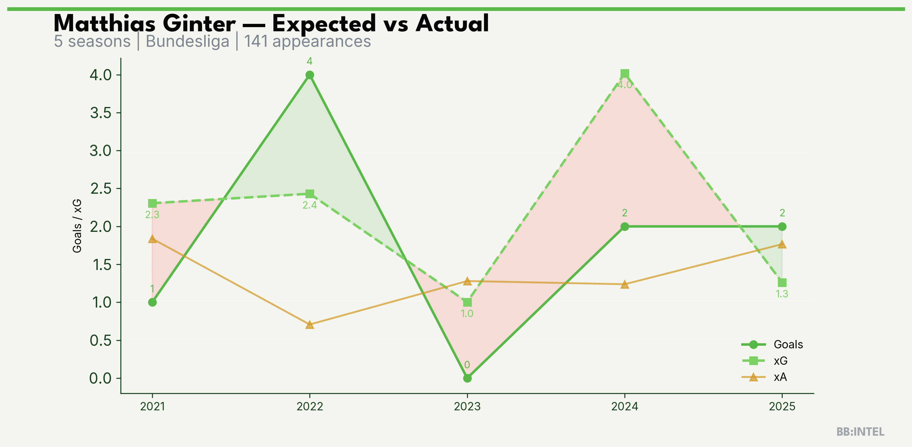 | 2024/2025 | Bundesliga | 32 | 2 | 4.0 | 1.2 | 24 | -2.0 |