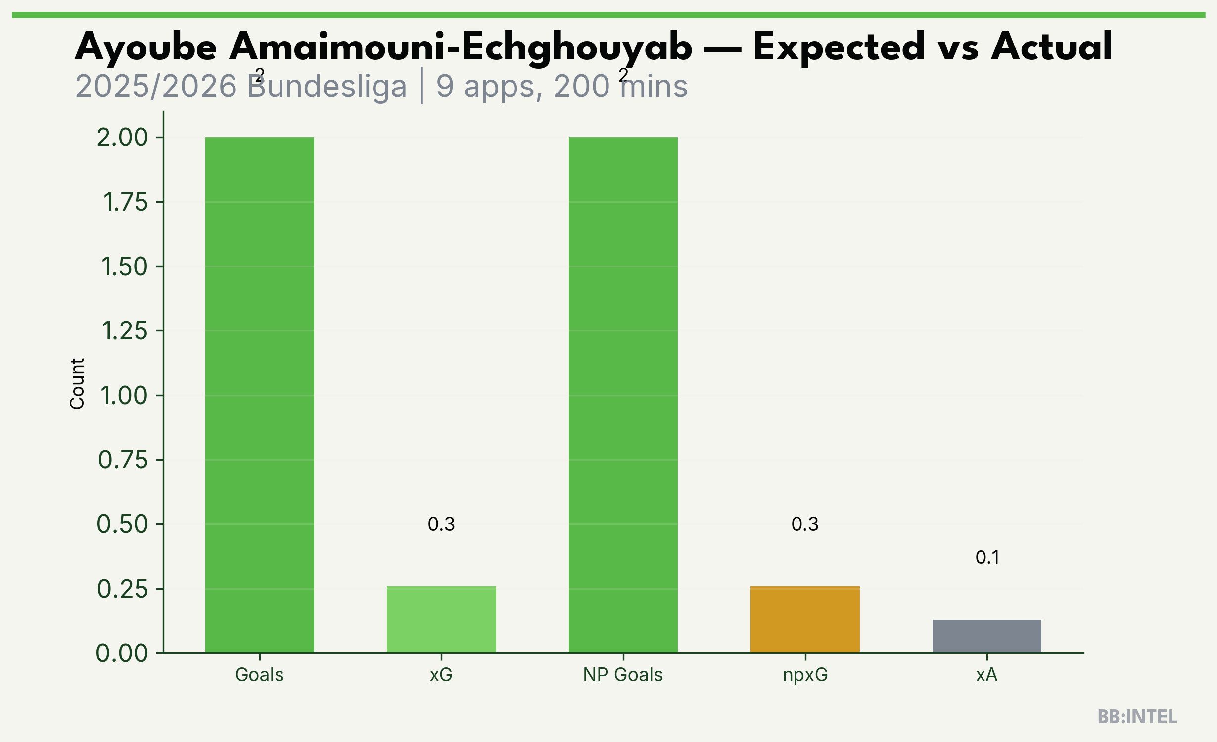 | 2025/2026 | Bundesliga | 9 | 2 | 0.3 | 0.1 | 6 | +1.7 |