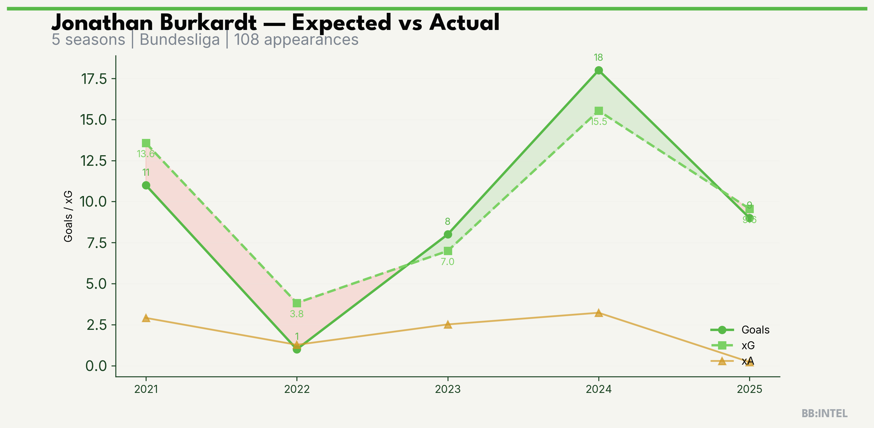 | 2023/2024 | Bundesliga | 21 | 8 | 7.0 | 2.5 | 41 | +1.0 |