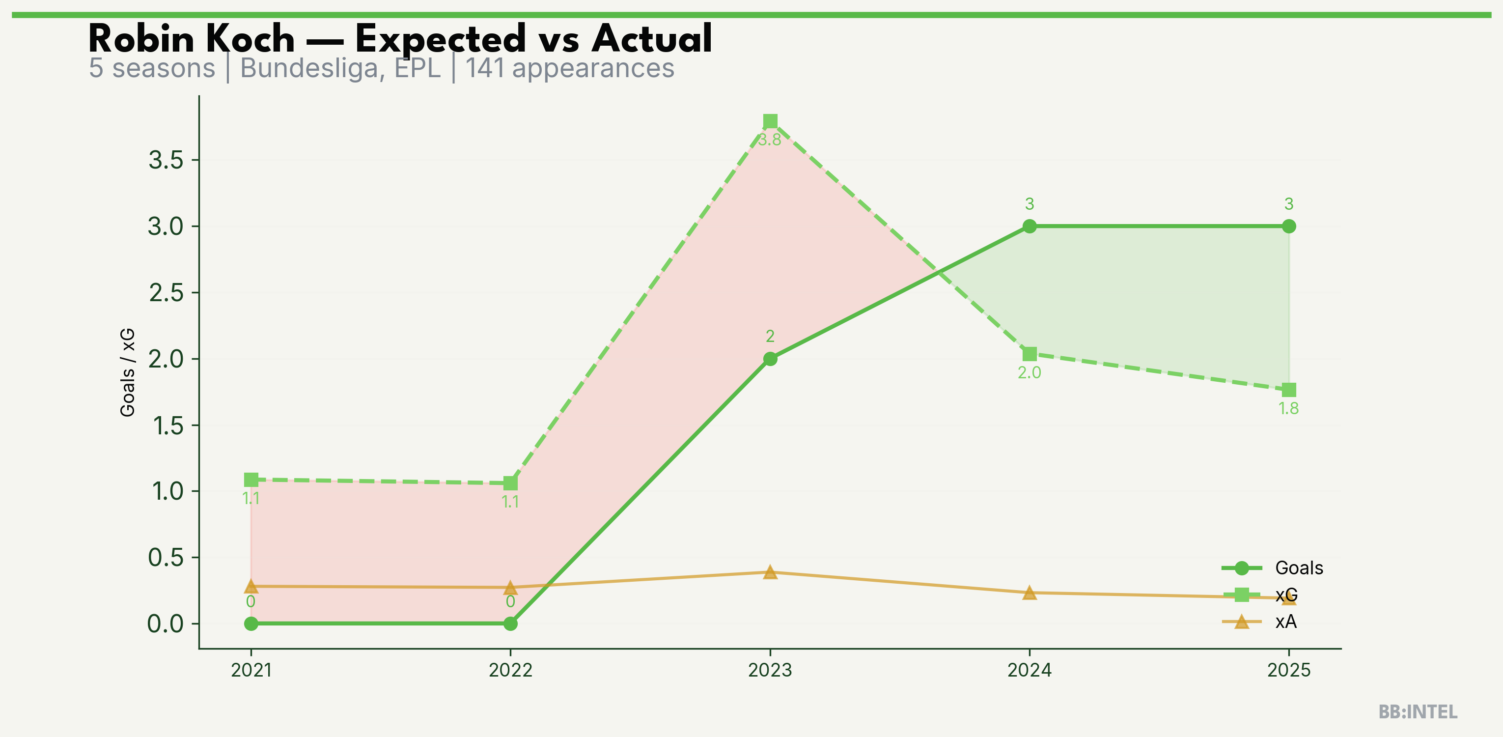 | 2025/2026 | Bundesliga | 24 | 3 | 1.8 | 0.2 | 12 | +1.2 |
