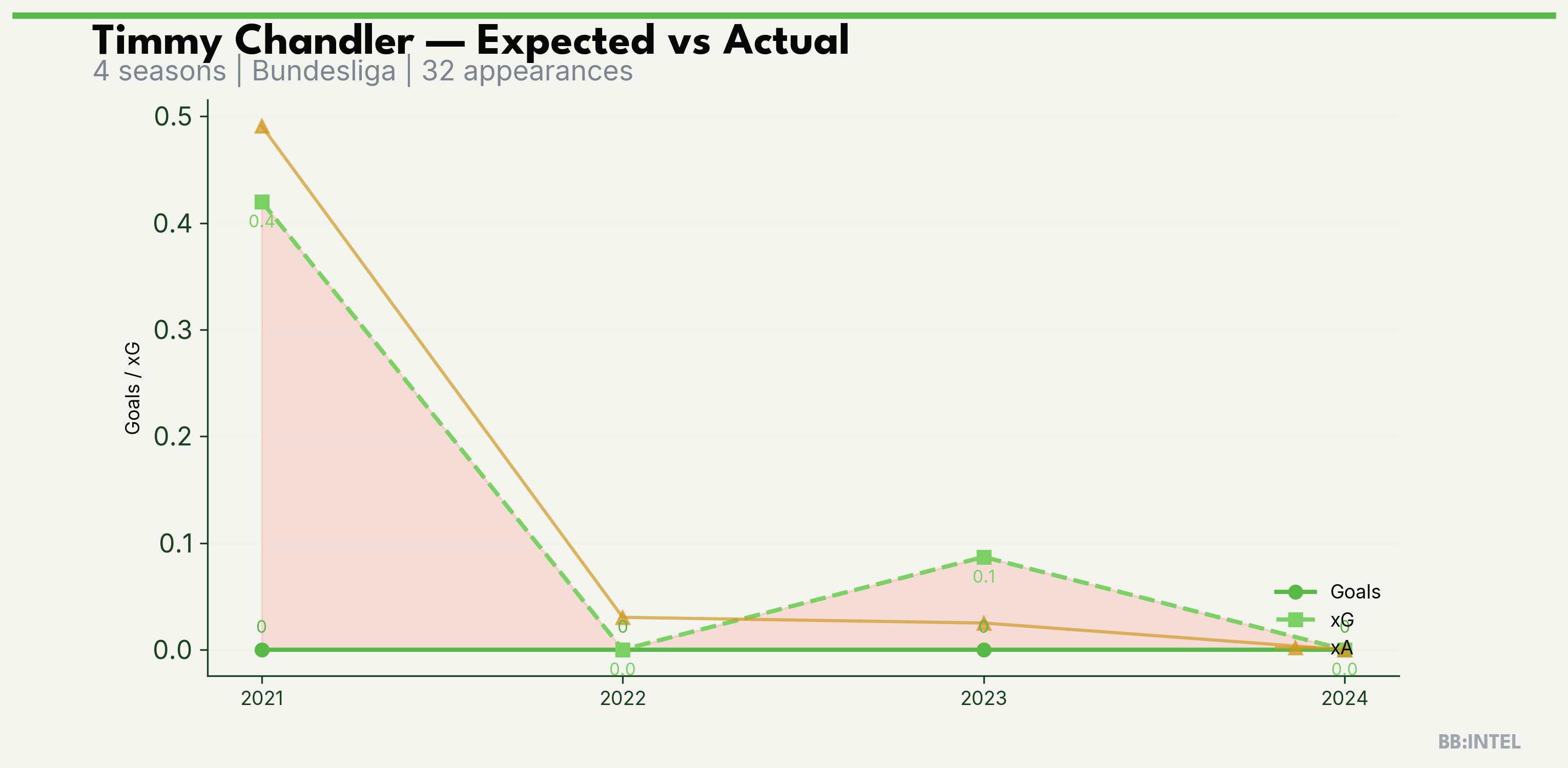 | 2023/2024 | Bundesliga | 6 | 0 | 0.1 | 0.0 | 2 | -0.1 |