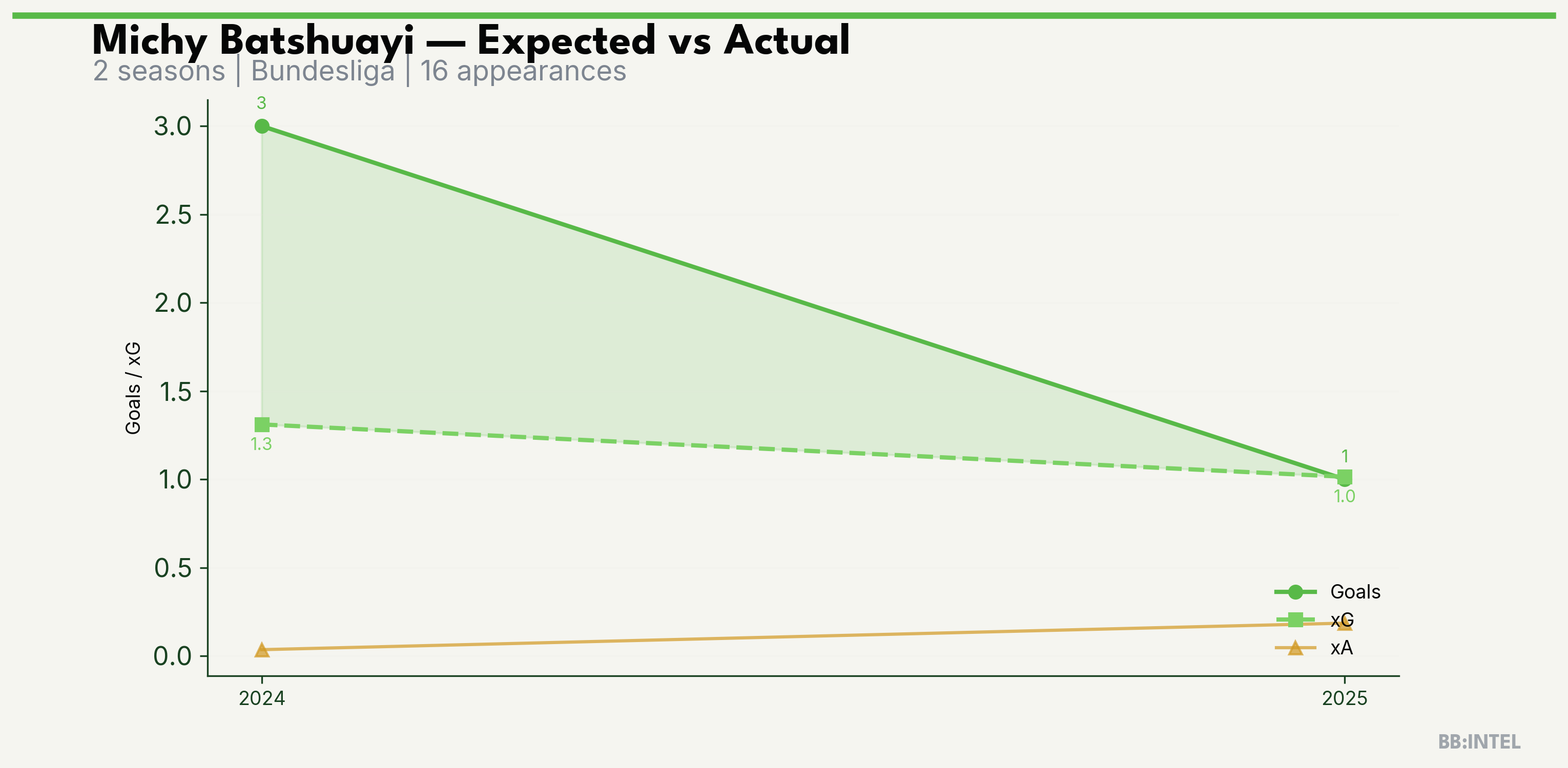 | 2025/2026 | Bundesliga | 6 | 1 | 1.0 | 0.2 | 5 | -0.0 |