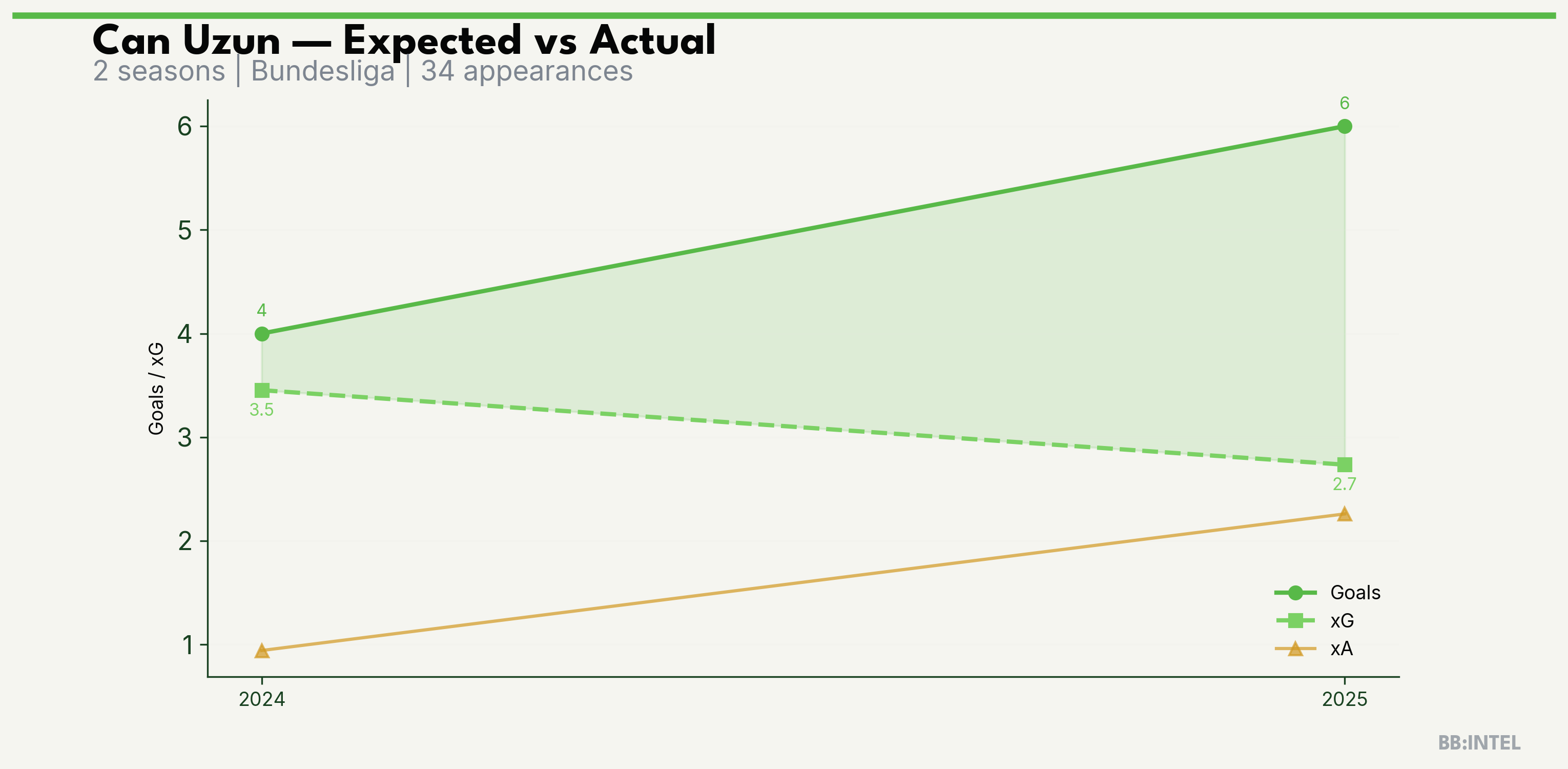 | 2025/2026 | Bundesliga | 14 | 6 | 2.7 | 2.3 | 27 | +3.3 |