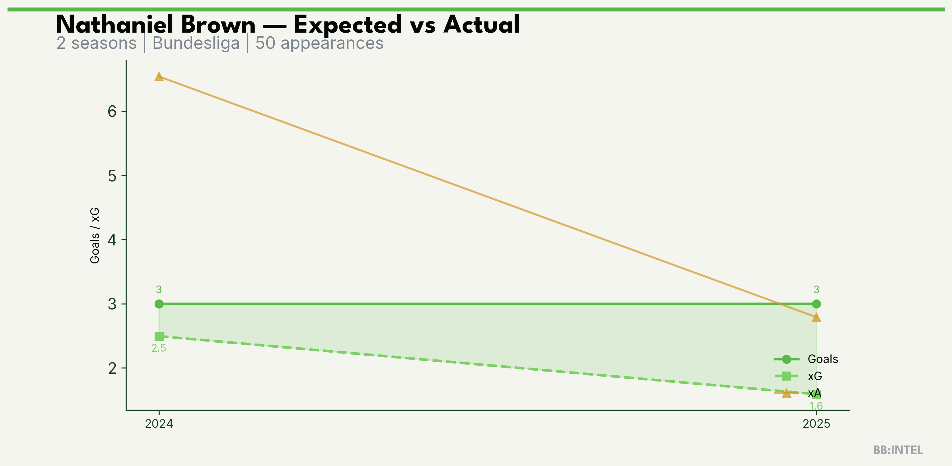 | 2025/2026 | Bundesliga | 24 | 3 | 1.6 | 2.8 | 16 | +1.4 |