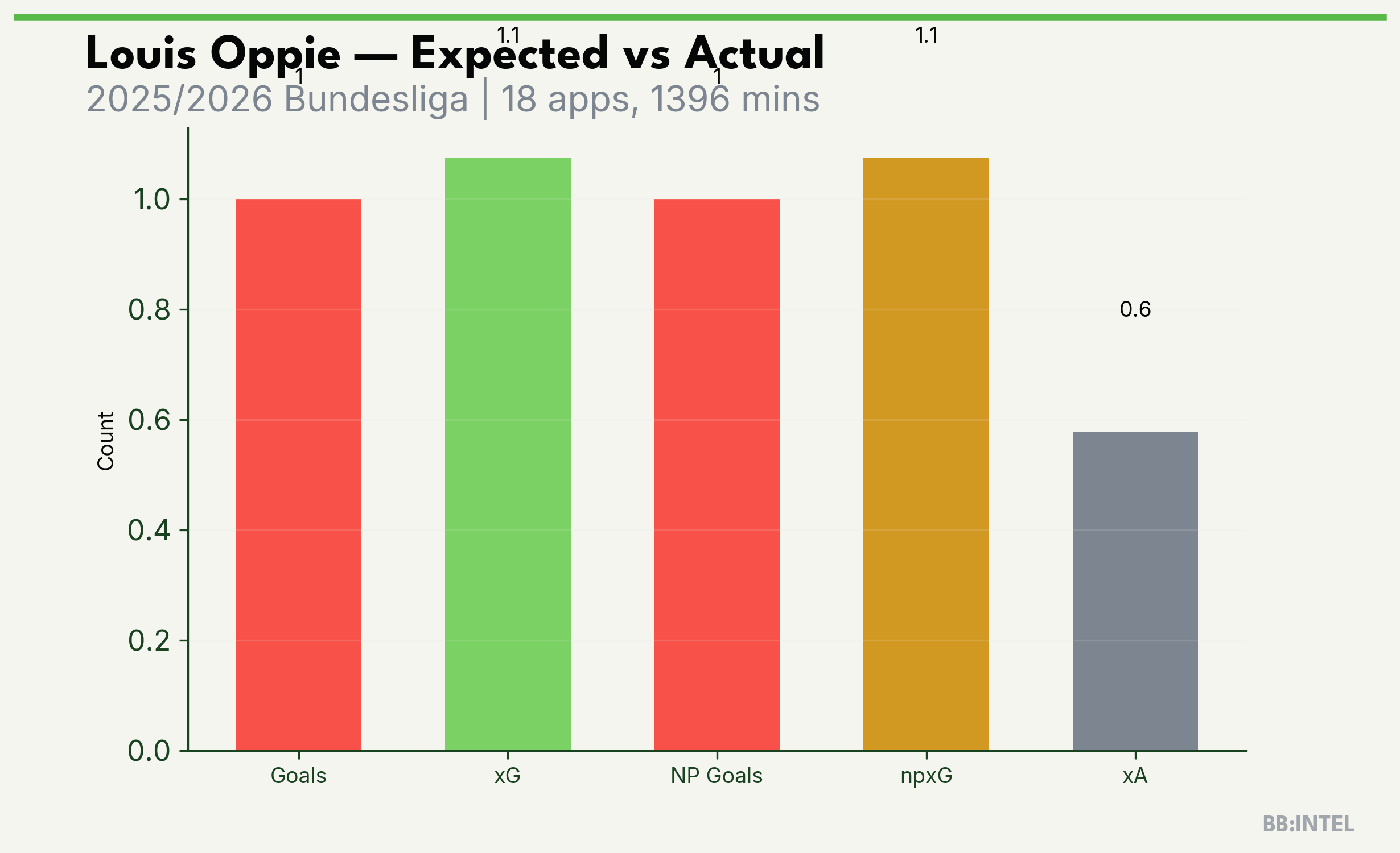| 2025/2026 | Bundesliga | 18 | 1 | 1.1 | 0.6 | 14 | -0.1 |