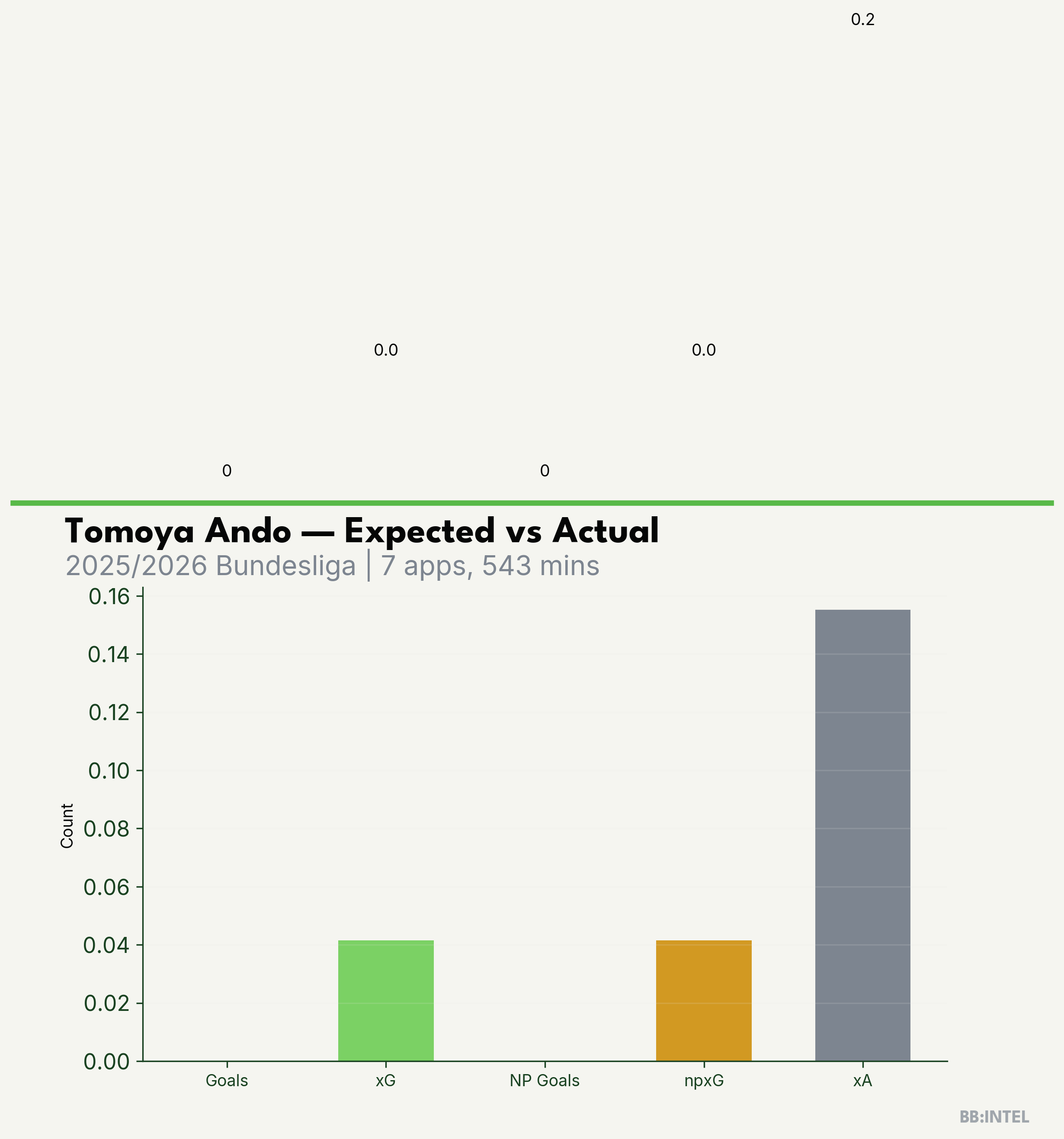 | 2025/2026 | Bundesliga | 7 | 0 | 0.0 | 0.2 | 1 | -0.0 |