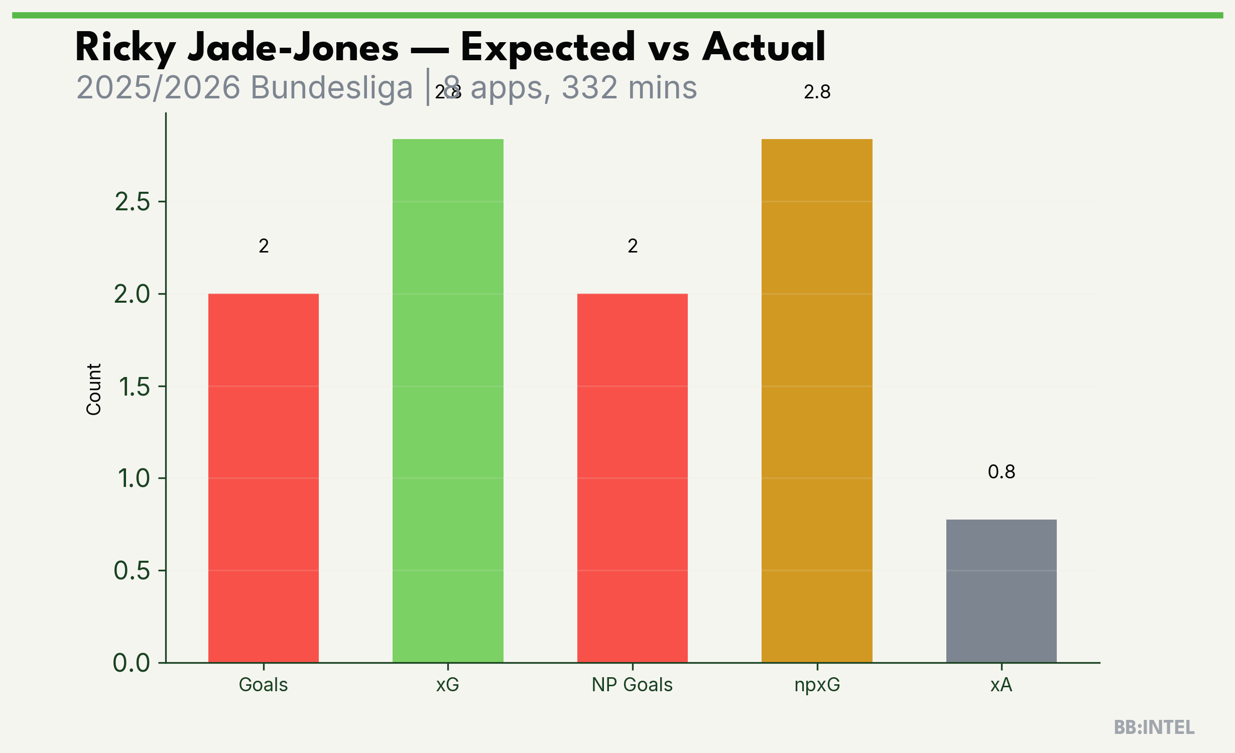 | 2025/2026 | Bundesliga | 8 | 2 | 2.8 | 0.8 | 11 | -0.8 |