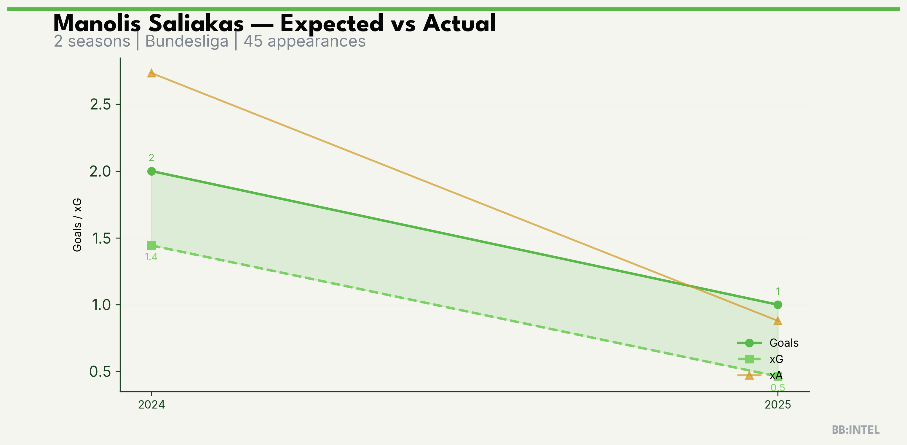 | 2024/2025 | Bundesliga | 30 | 2 | 1.4 | 2.7 | 29 | +0.6 |