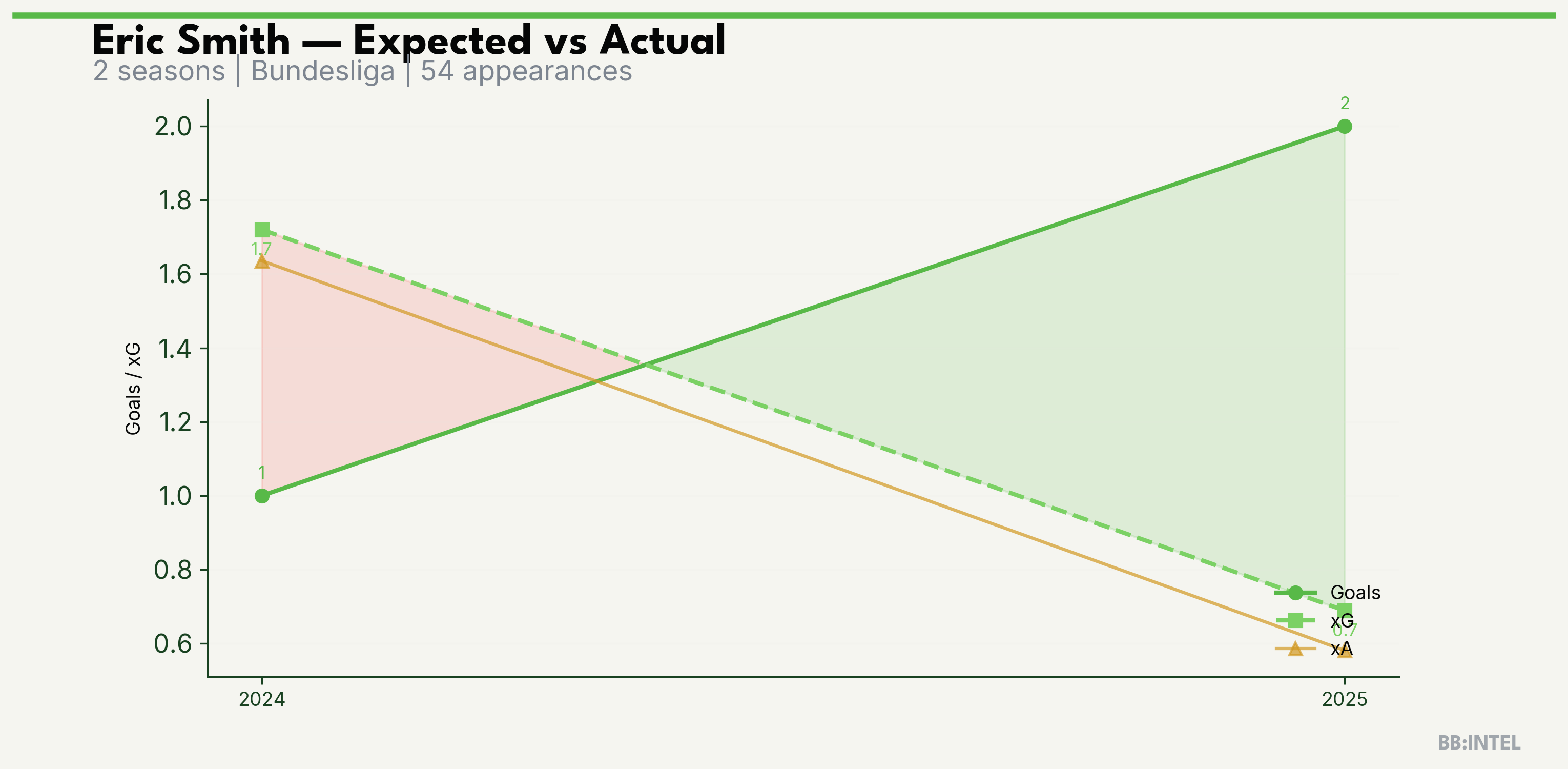 | 2025/2026 | Bundesliga | 22 | 2 | 0.7 | 0.6 | 10 | +1.3 |