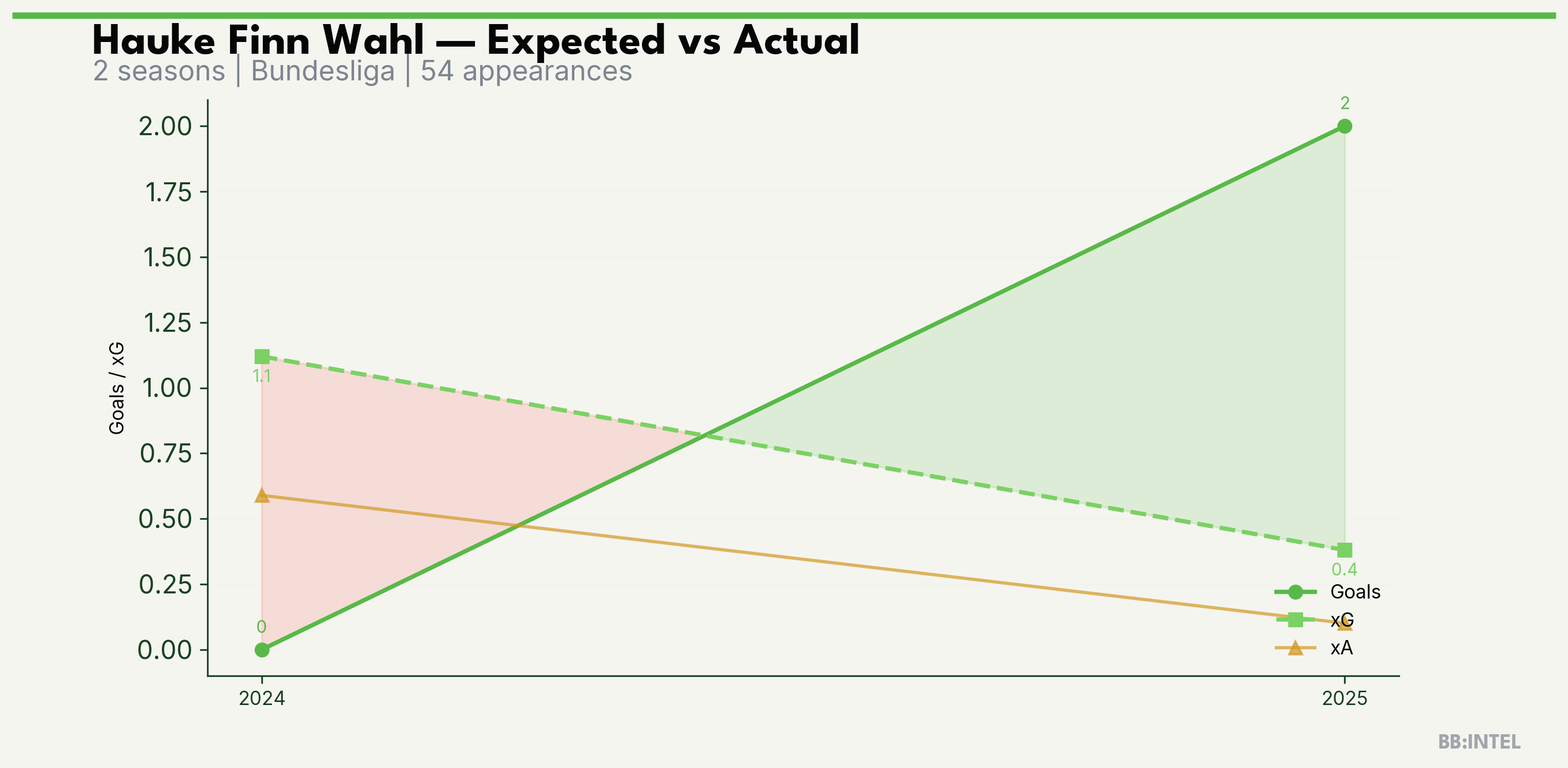 | 2025/2026 | Bundesliga | 21 | 2 | 0.4 | 0.1 | 6 | +1.6 |